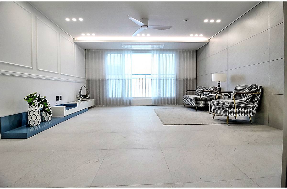 문 열자마자 바닥부터 확인했는데요, 화이트 포세린 타일이 깔려 있어서 집이 엄청 환하고 넓어 보이더라고요. 천장은 우물형으로 층고를 높였고 실링팬이 돌아가고 있었는데, 이게 인테리어 효과도 좋지만 여름엔 에어컨 효율도 확 높여주죠. 시스템 에어컨은 기본 옵션이고요. 4~5인용 소파를 놔도 충분해서 식구 많은 집도 거뜬하겠더라고요.