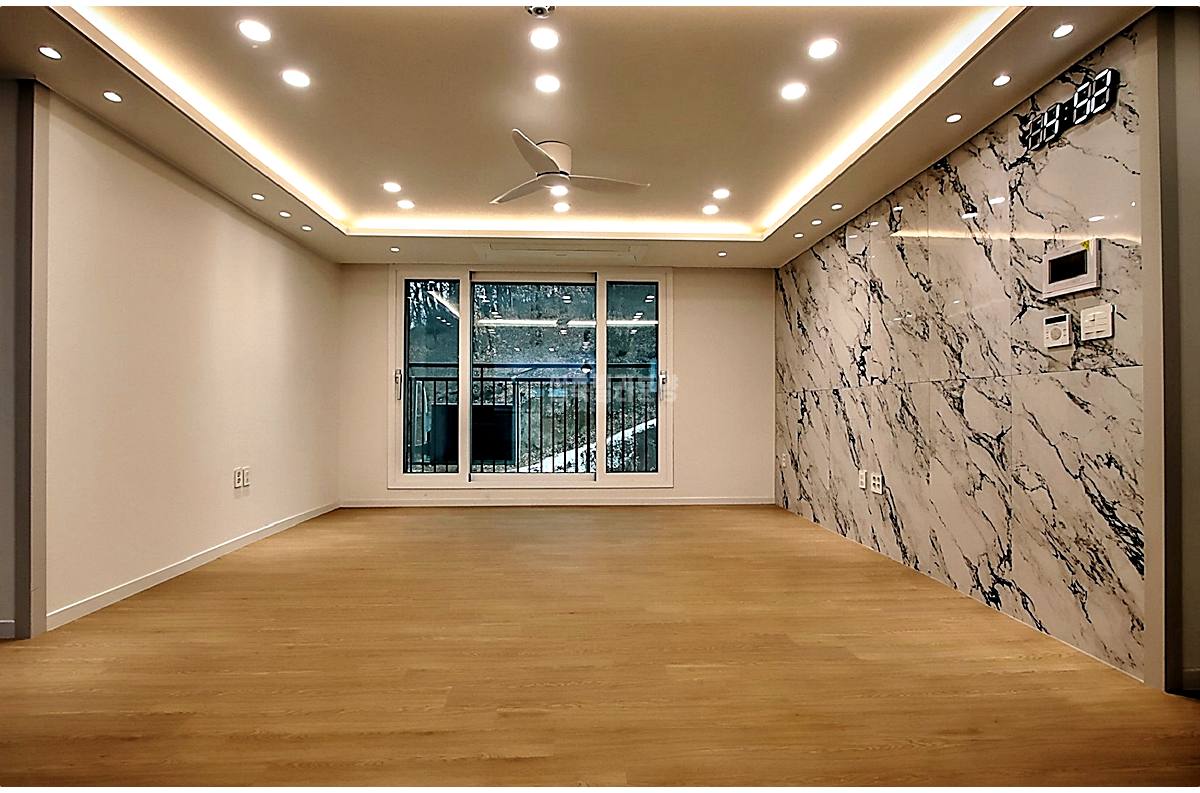 당하동신축빌라 거실 창 너머로 펼쳐지는 사계절 마운틴 뷰는 이 집이 가진 최고의 선물입니다. 5~6인용 소파를 배치해도 넉넉한 거실은 실링팬과 시스템 에어컨이 기본 옵션으로 설치되어 쾌적함을 더했네요.