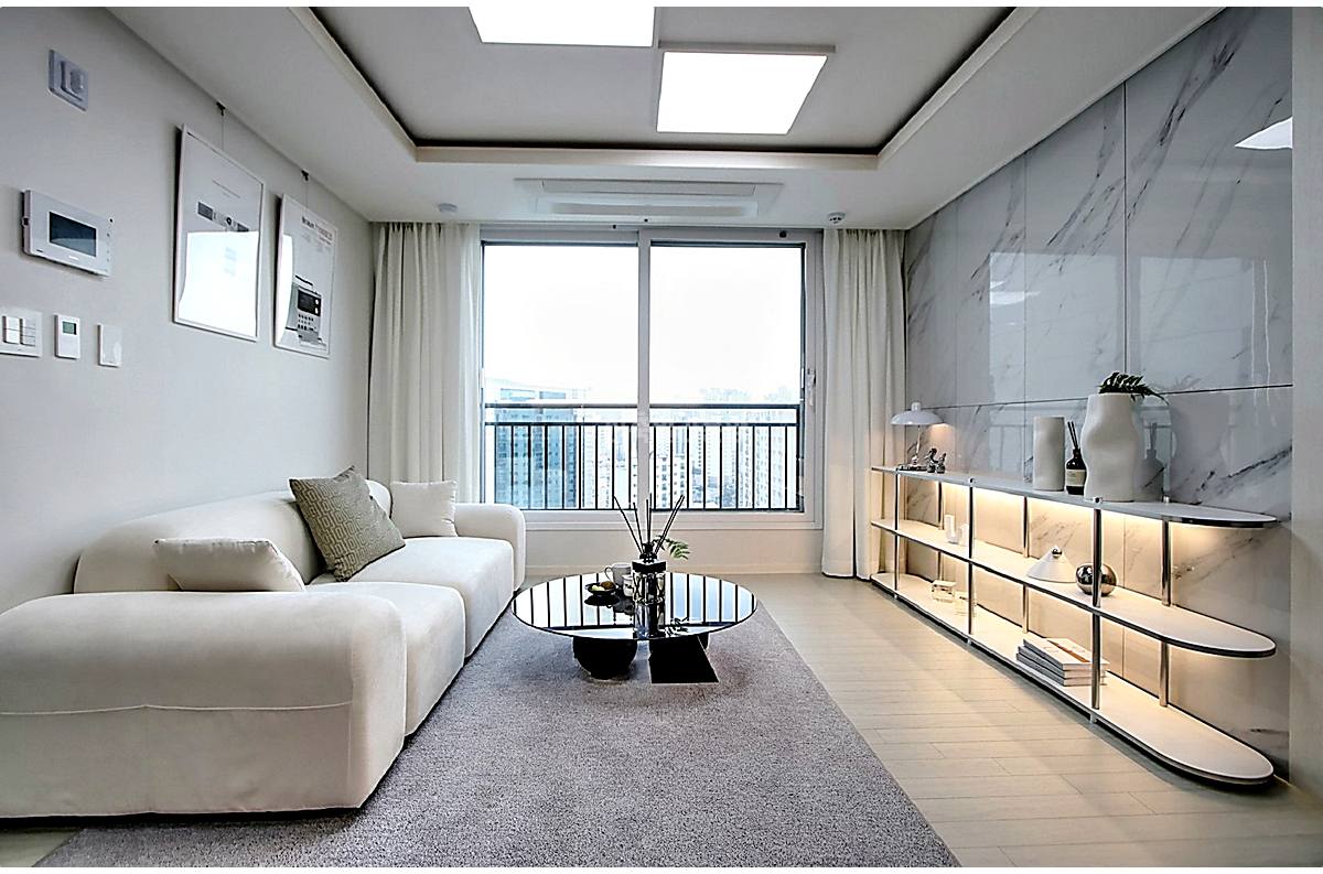 소파랑 큰 TV장을 놓아도 전혀 답답하지 않을 만큼 폭이 넉넉해요. 천장에는 시스템 에어컨이 기본이고요. 요즘 필수인 전열교환기까지 설치돼서 공기 질 관리하기에도 딱이겠네요.