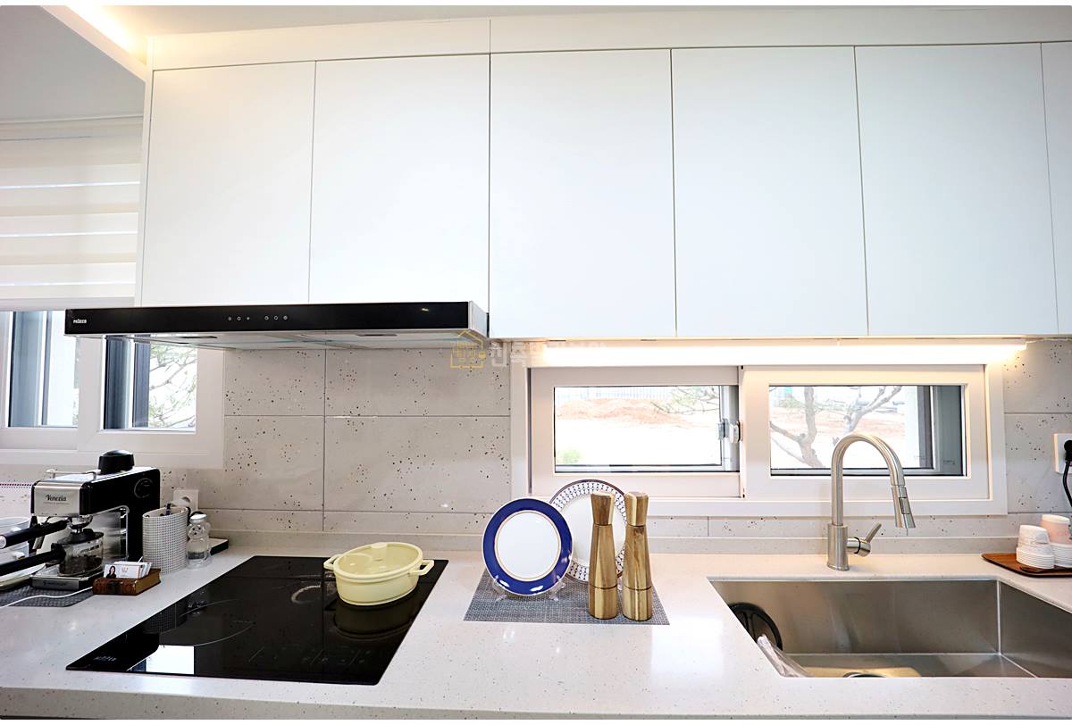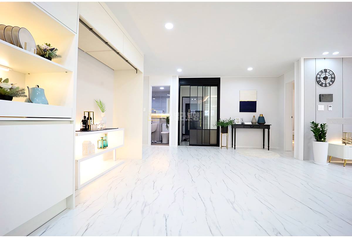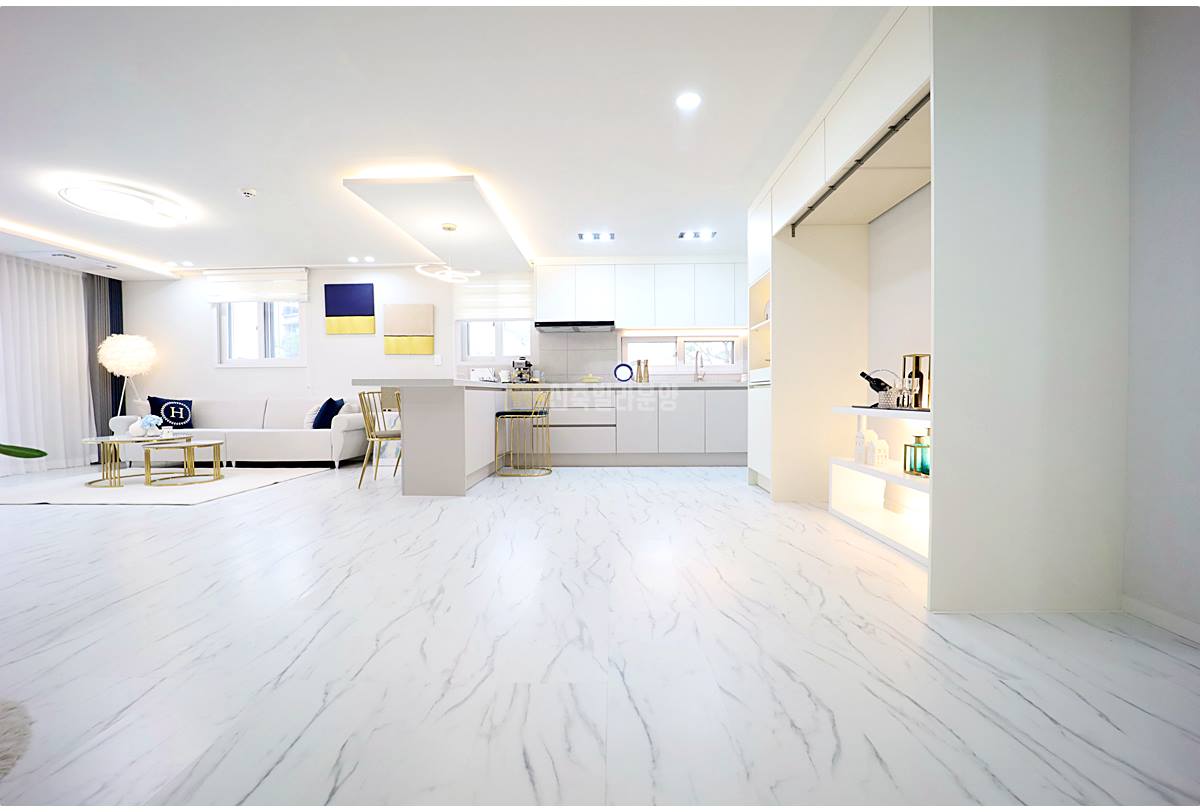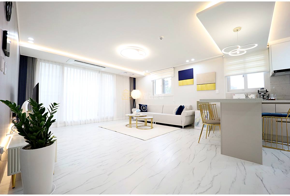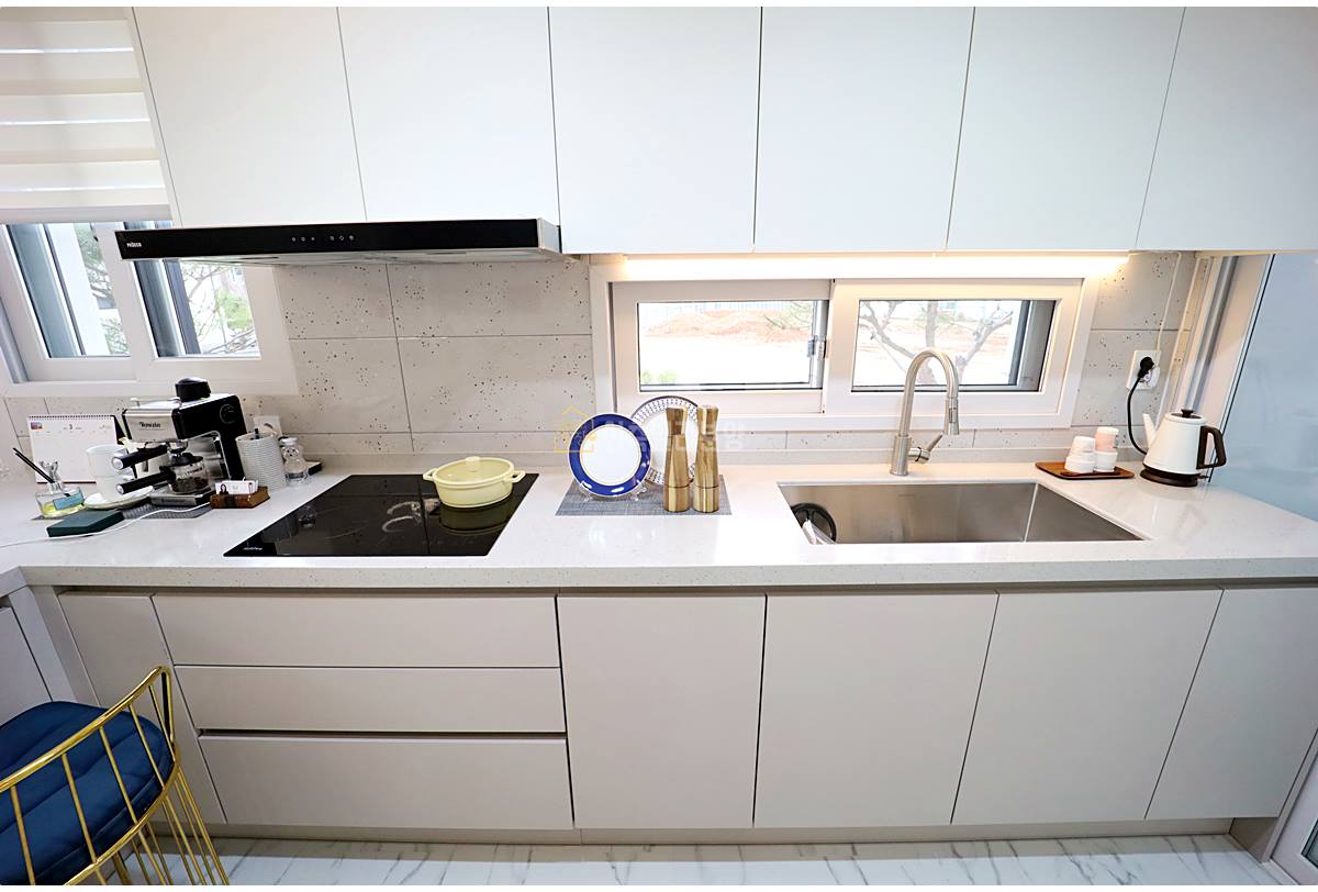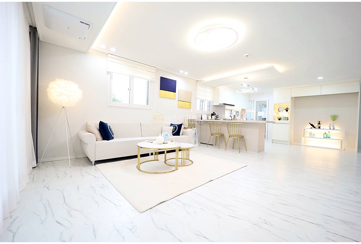 🛋️ 거실과 주방 공간거실은 양창 구조로 설계되어 채광과 통풍이 매우 우수합니다. 세련되고 화사한 분위기로 마감되었으며, 천장에는 시스템 에어컨과 전열교환기가 설치되어 사계절 쾌적한 실내 환경을 유지할 수 있습니다. 주방은 전실과 연결된 ㄱ자 구조이며, 안쪽으로 다용도실이 이어져 있습니다.