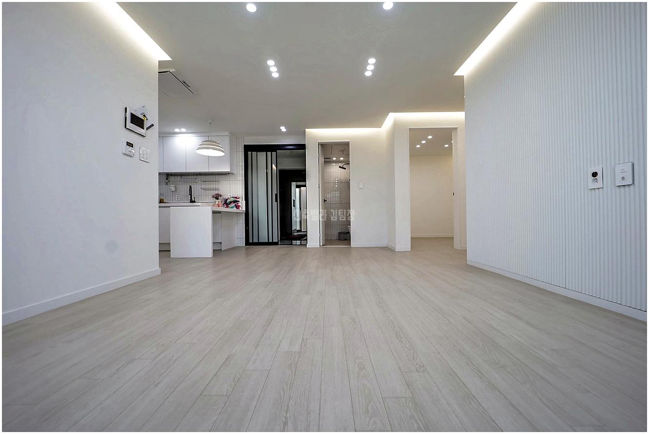 바닥은 옅은 톤의 강마루로 시공되어 화이트 인테리어와 조화를 이루며 전체적으로 밝고 깨끗한 인상을 줍니다.