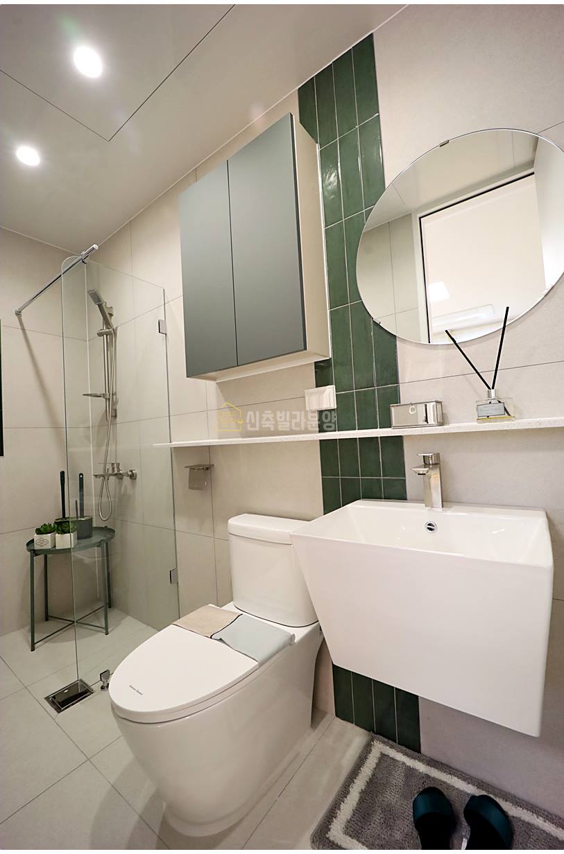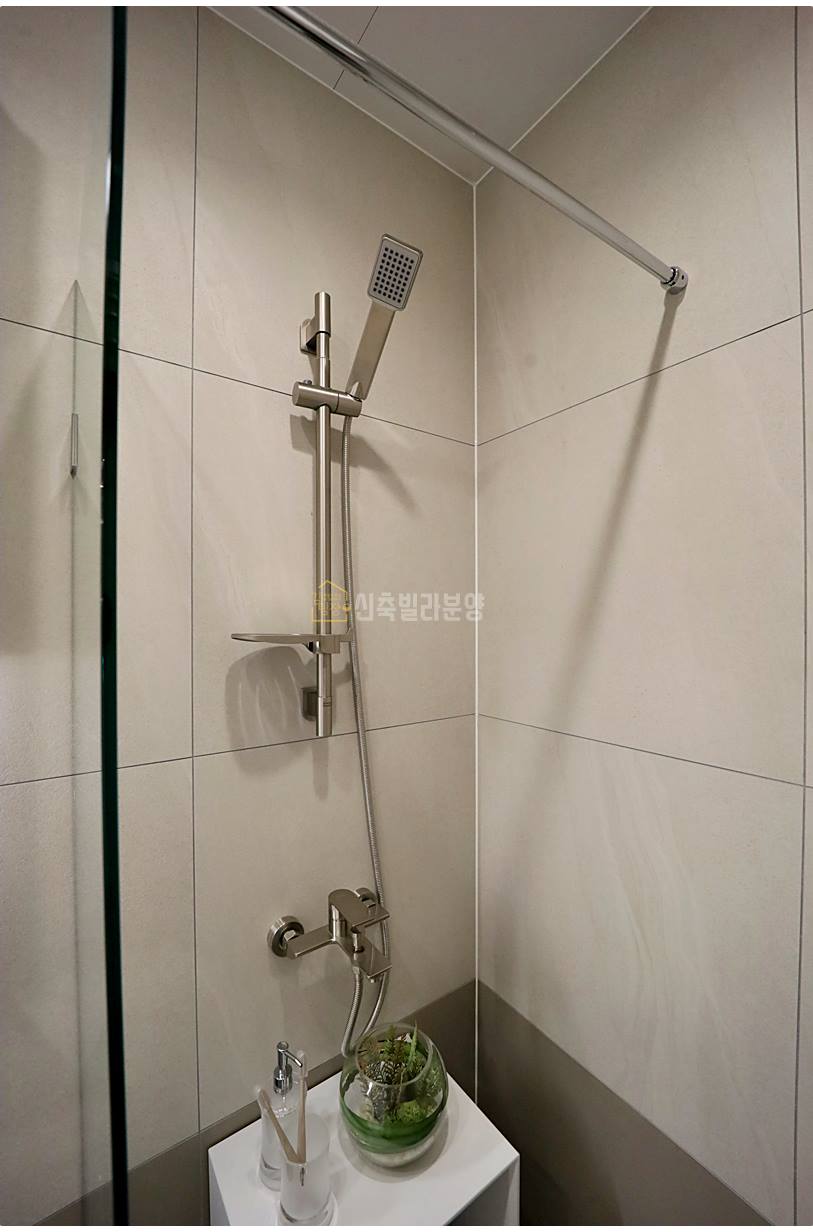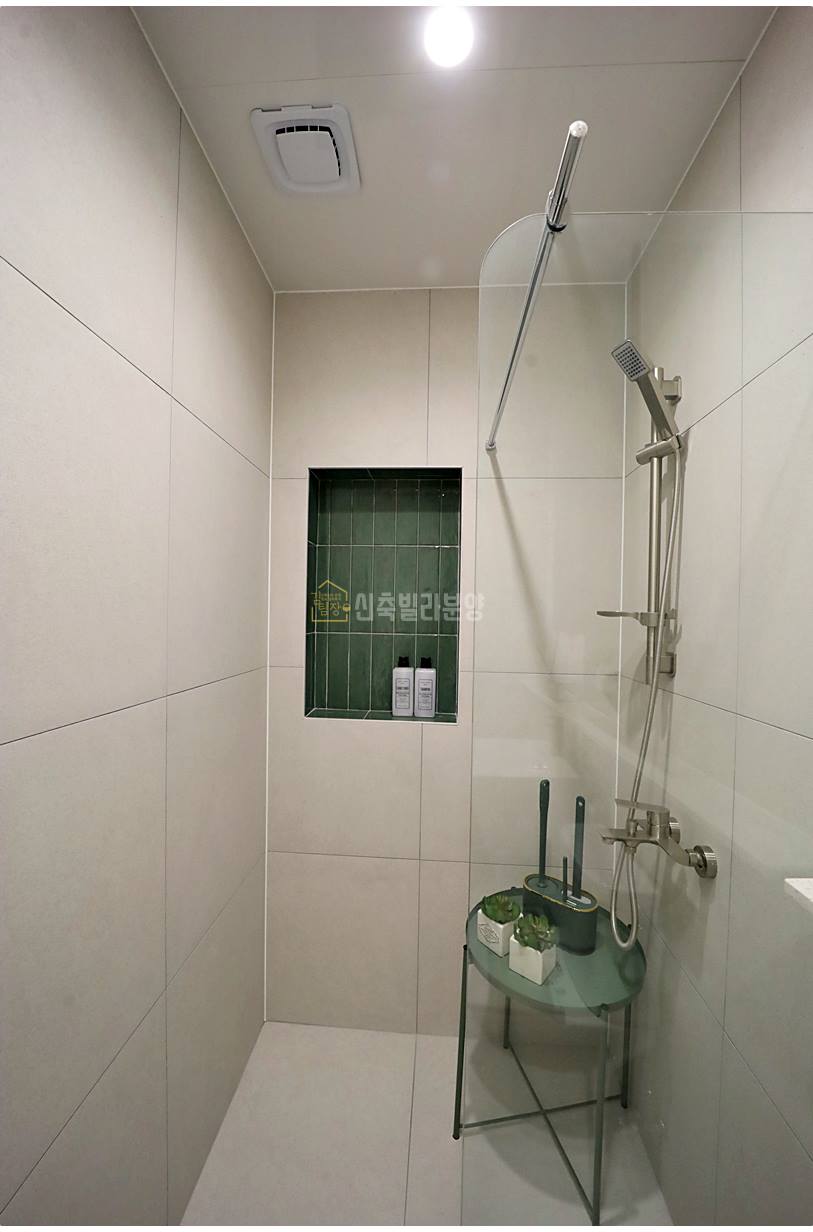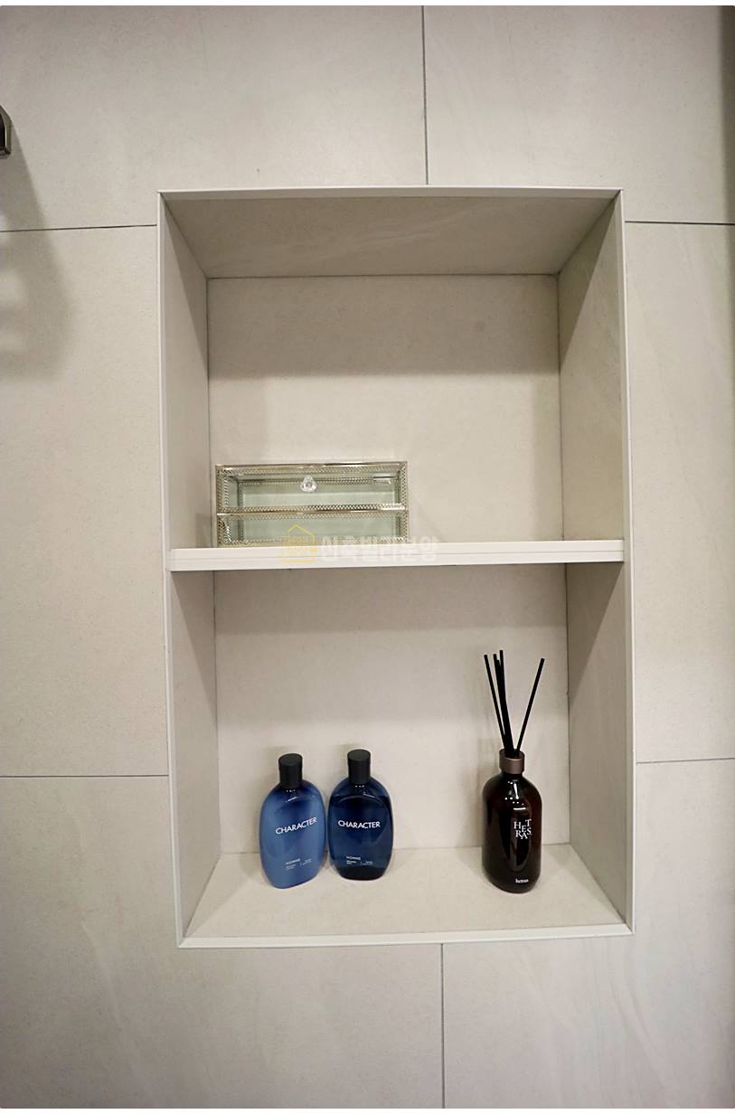 메인 욕실은 안쪽으로 물 튀김을 막아주는 유리 파티션을 설치한 샤워공간이 확보되어 있습니다. 선반은 매립형으로 마감되어 더욱 깔끔하게 사용할 수 있으며, 서브 욕실 역시 구성이 탄탄합니다.