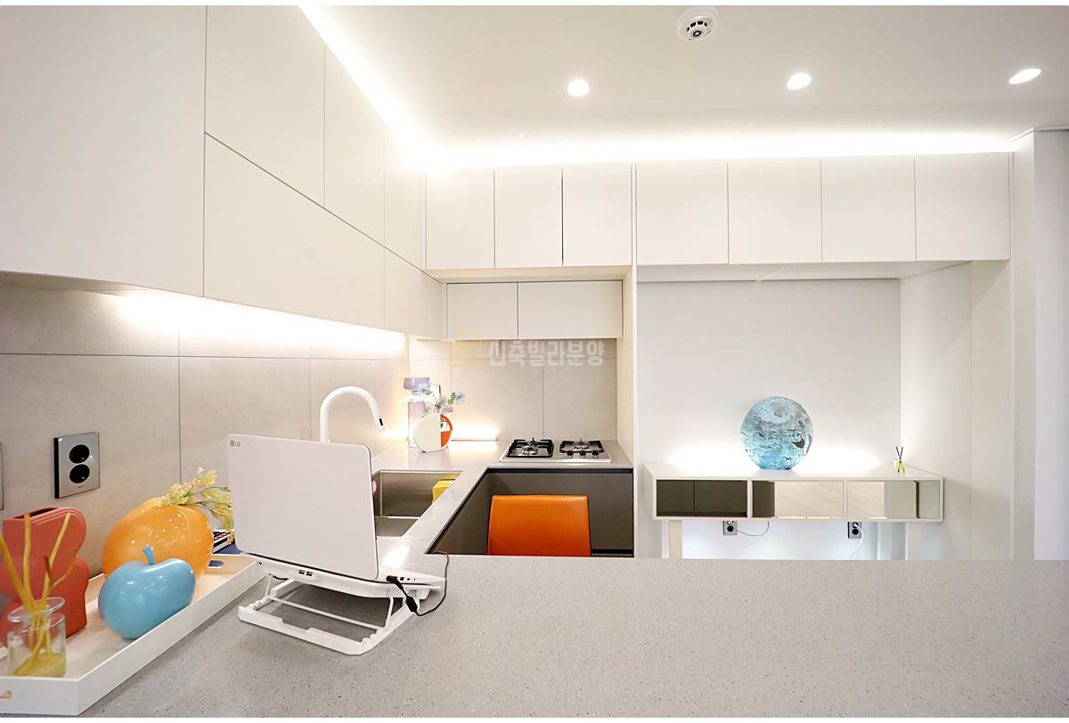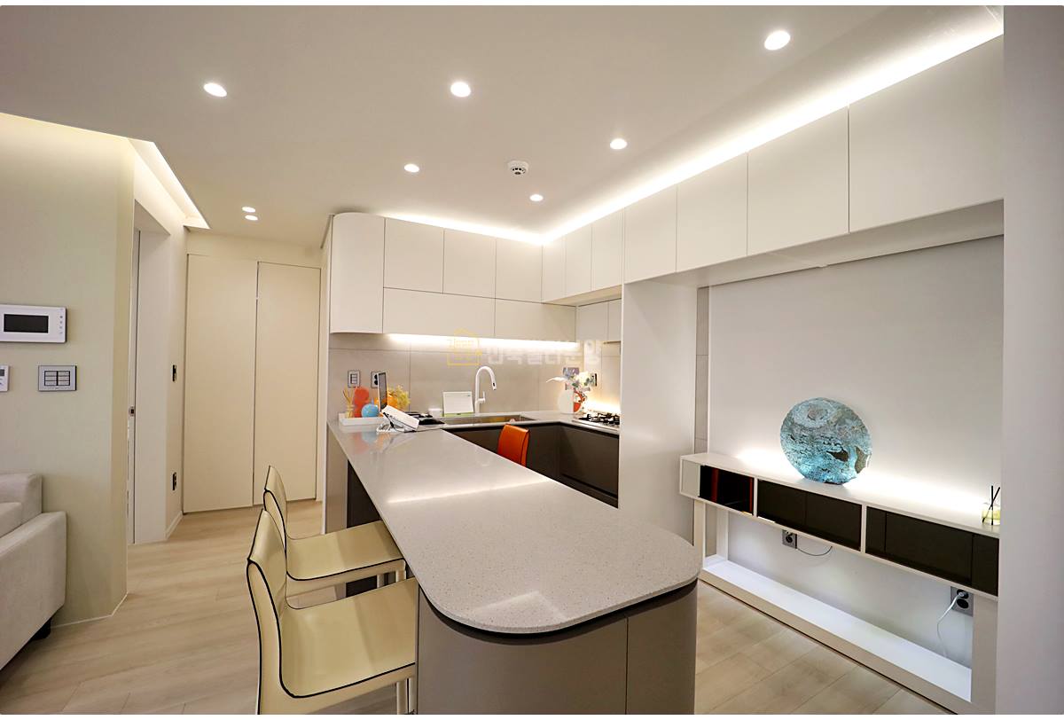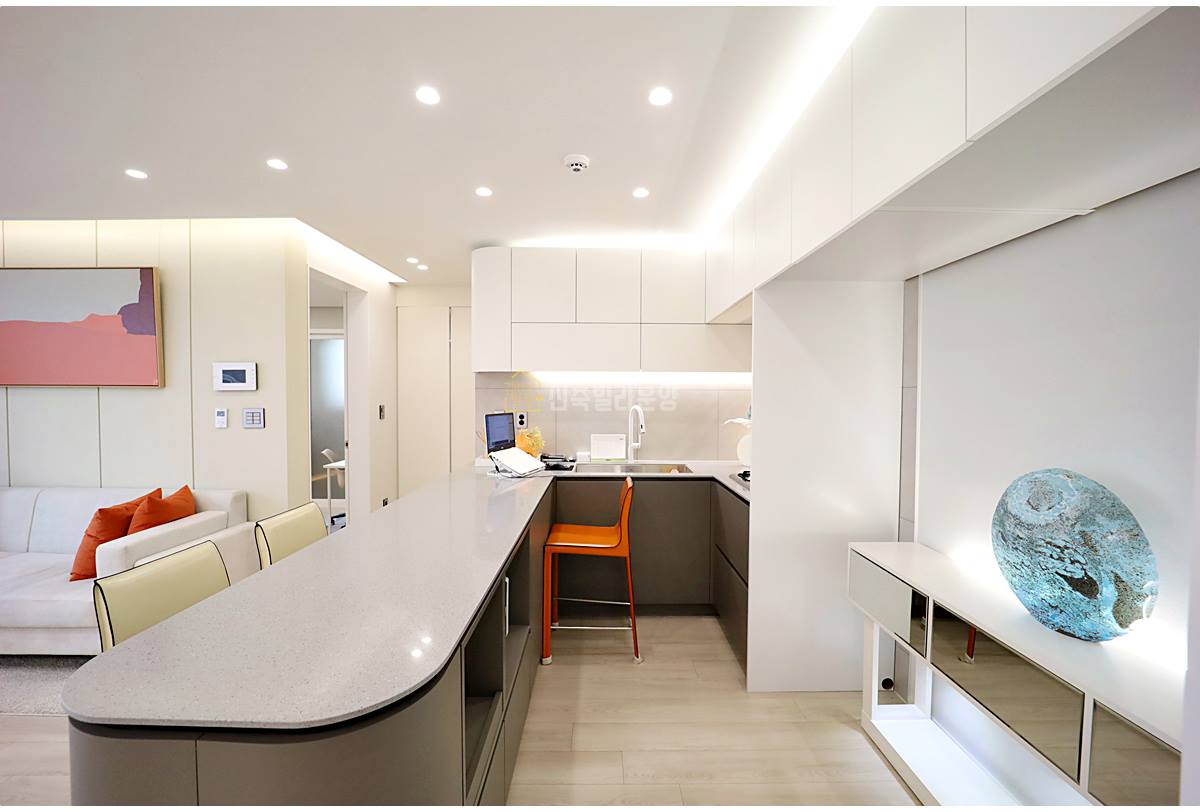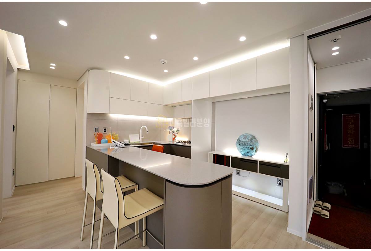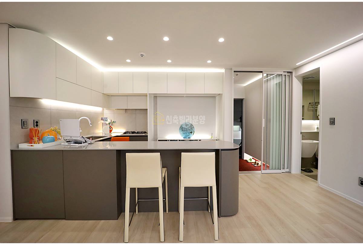 라운드진 상하부장과 활용도 높은 아일랜드 식탁이 일체형으로 연결되어 이동 동선이 편리합니다. 화력 좋은 3구 레인지와 넓은 사각 싱크볼 등 기본 구성이 알차게 갖춰져 있으며, 냉장고 공간도 마련되어 있습니다.