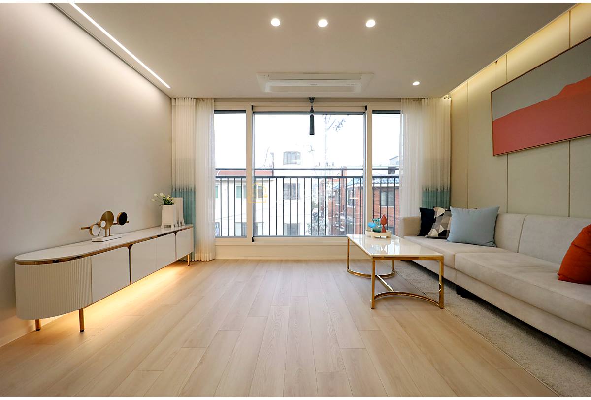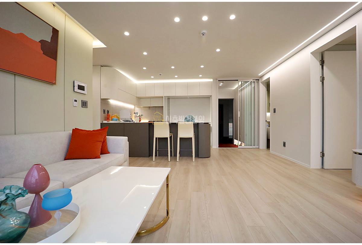 거실 천장에 매립된 핀 조명이 밤하늘의 별 같은 무드를 자아냅니다. 시스템 에어컨이 깔끔하게 매립되어 있으며, 소파와 서랍장을 두어도 여유로운 공간감이 느껴집니다.