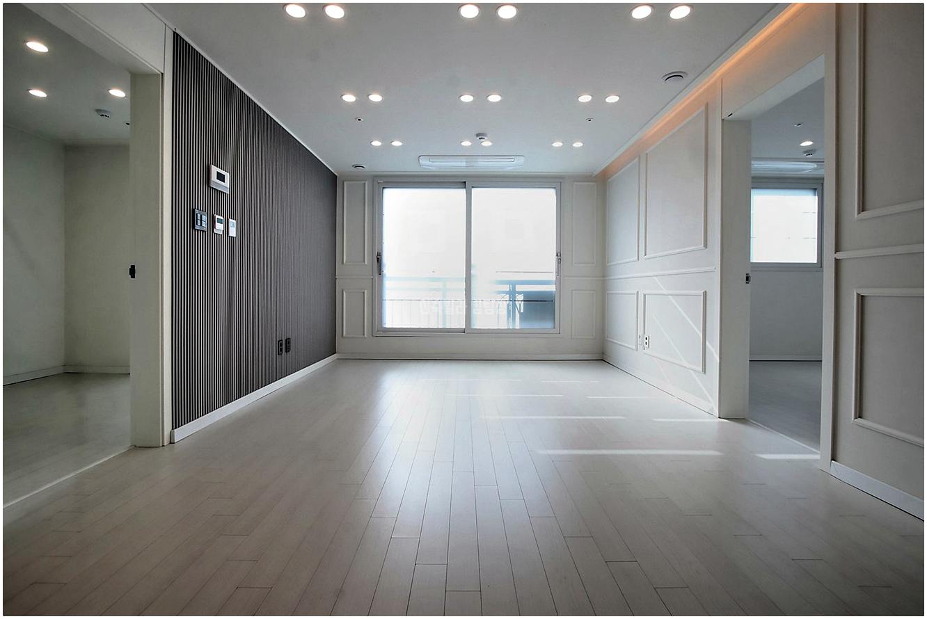 광명신축빌라 거실은 소파와 거실장, TV장을 넉넉히 배치할 수 있을 만큼 여유롭습니다. 아트보드와 웨인스코팅 인테리어, 천장 매립조명에 시스템 에어컨까지 갖춰져 있어 별도 공사 없이도 세련된 분위기를 즐길 수 있죠.