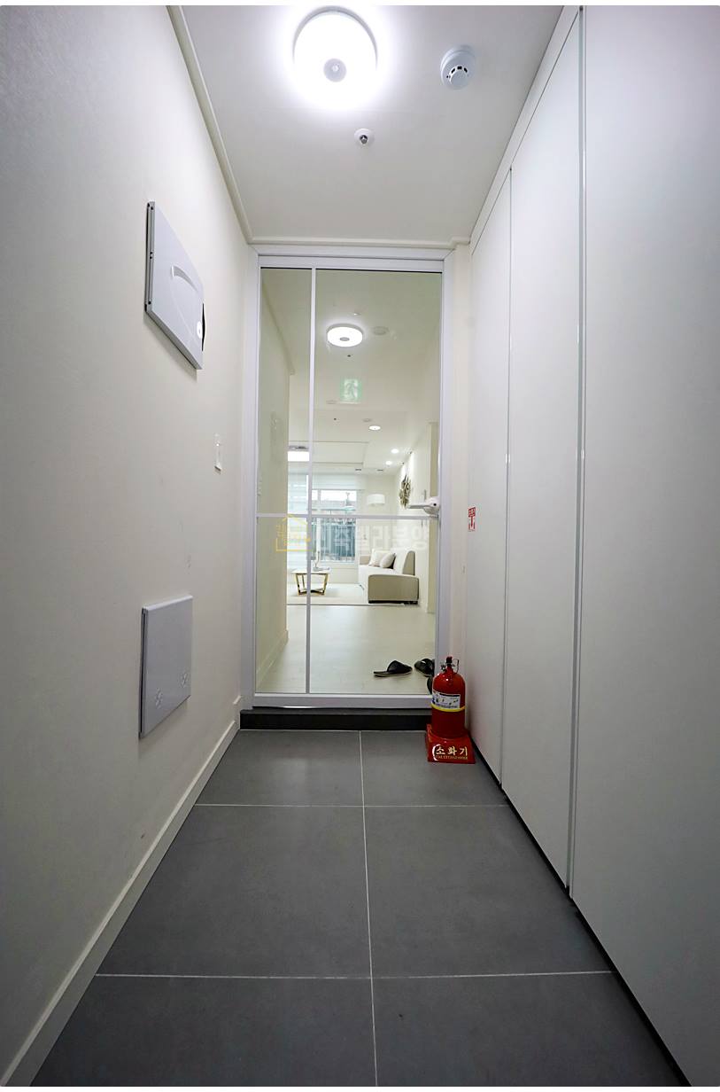 복도 형태로 길게 뻗어 각 공간을 완벽하게 분리해 프라이빗한 생활이 가능합니다. 전실 공간은 신발 오염에 강한 어두운 타일로 마감했으며, 신발수납장과 일괄소등 스위치, 내부에서 엘리베이터 호출 가능한 버튼까지 갖췄습니다.
