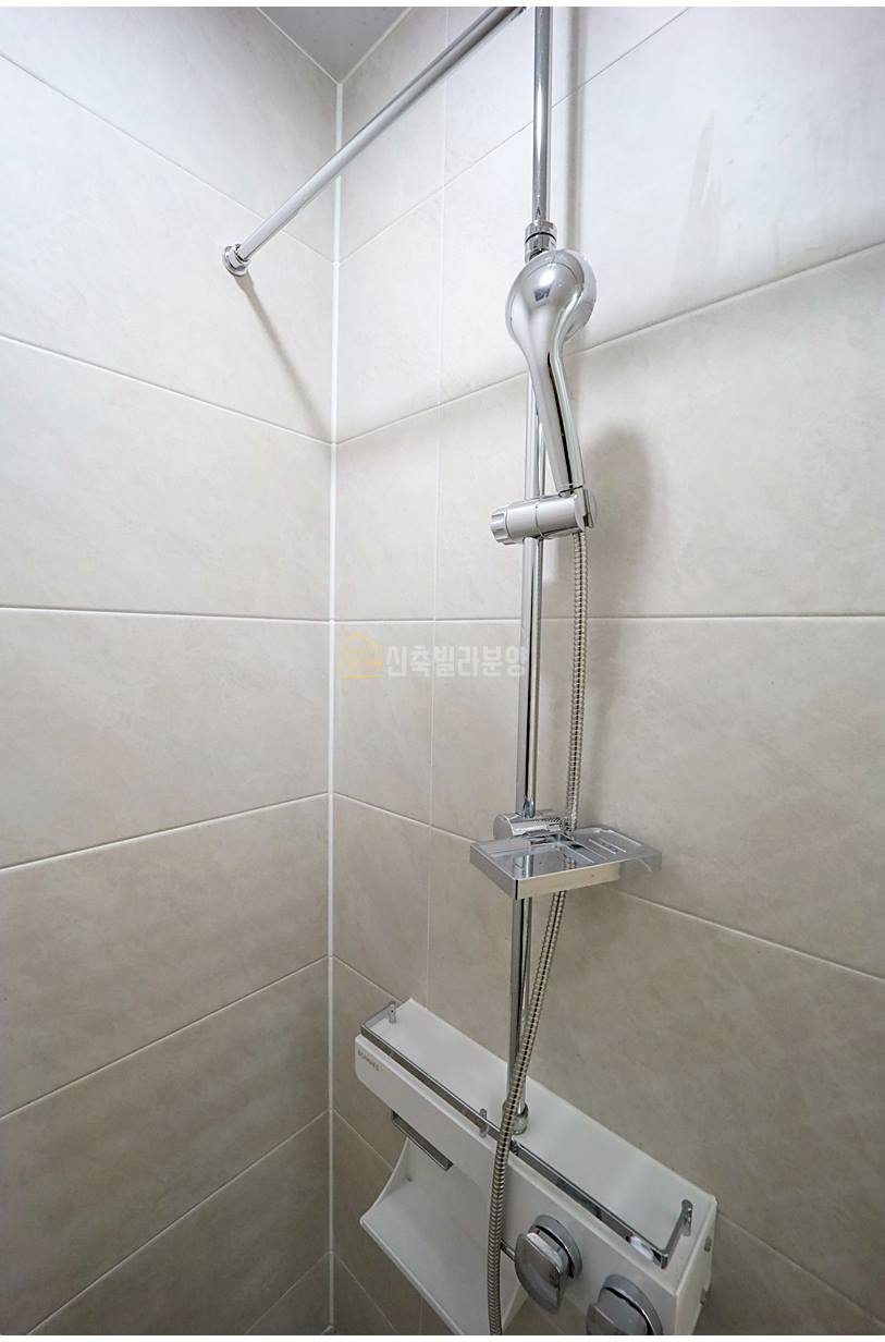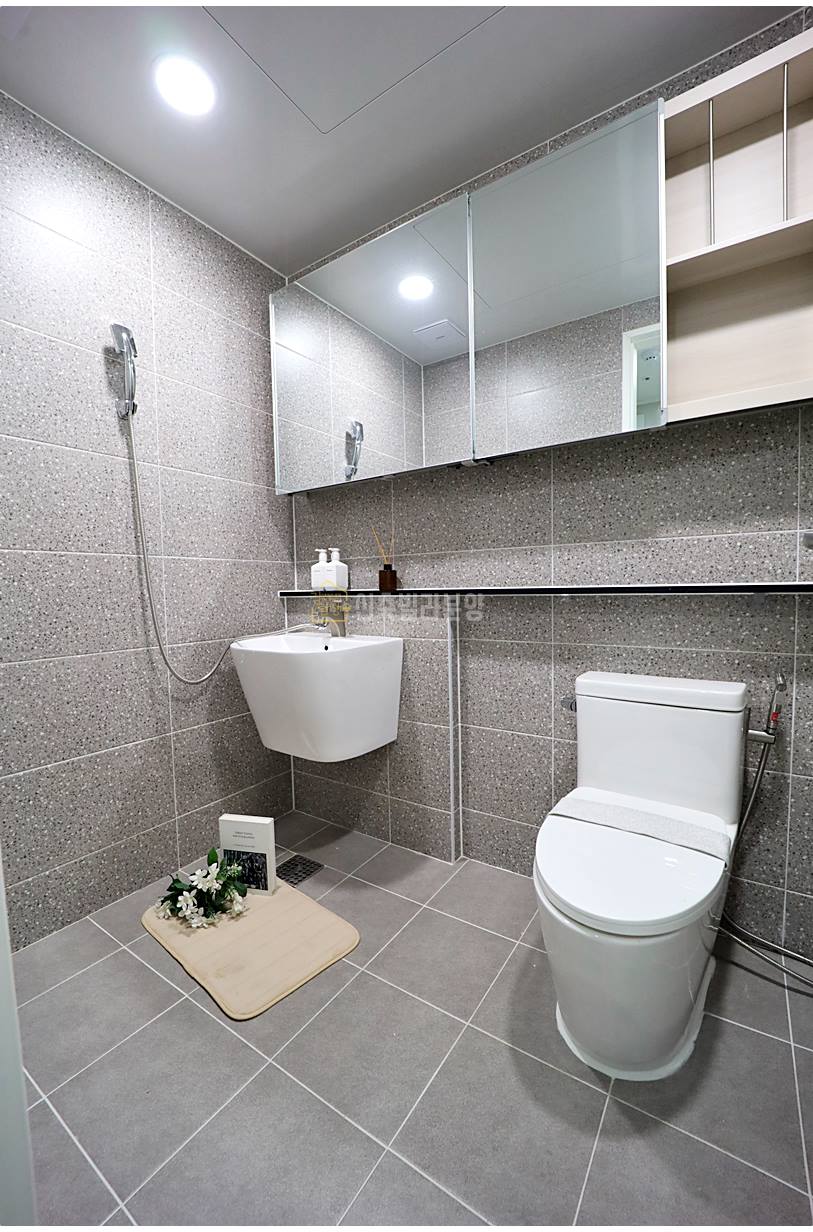 욕실은 샤워 파티션을 설치해 물 튀김을 최소화했으며, 모던한 컬러 타일로 통일감 있게 마감했습니다. 미러 슬라이딩장, 젠다이 선반, 세면대가 완비되어 있고, 천장에는 제습 관리를 위한 자동환기시스템이 시공되어 쾌적함을 유지합니다.