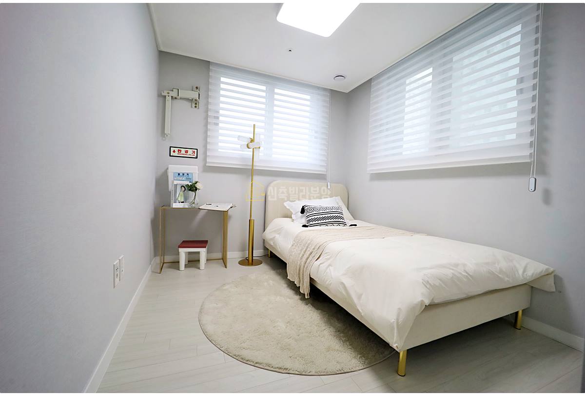 김포신축빌라 매매 침실은 창을 통해 자연 채광이 풍부하게 들어오며, 침대와 서랍장, 옷장 등 기본 가구를 배치하기 좋은 넉넉한 크기입니다. 부담스럽지 않은 인테리어로 원하는 스타일로 꾸미기 좋습니다.