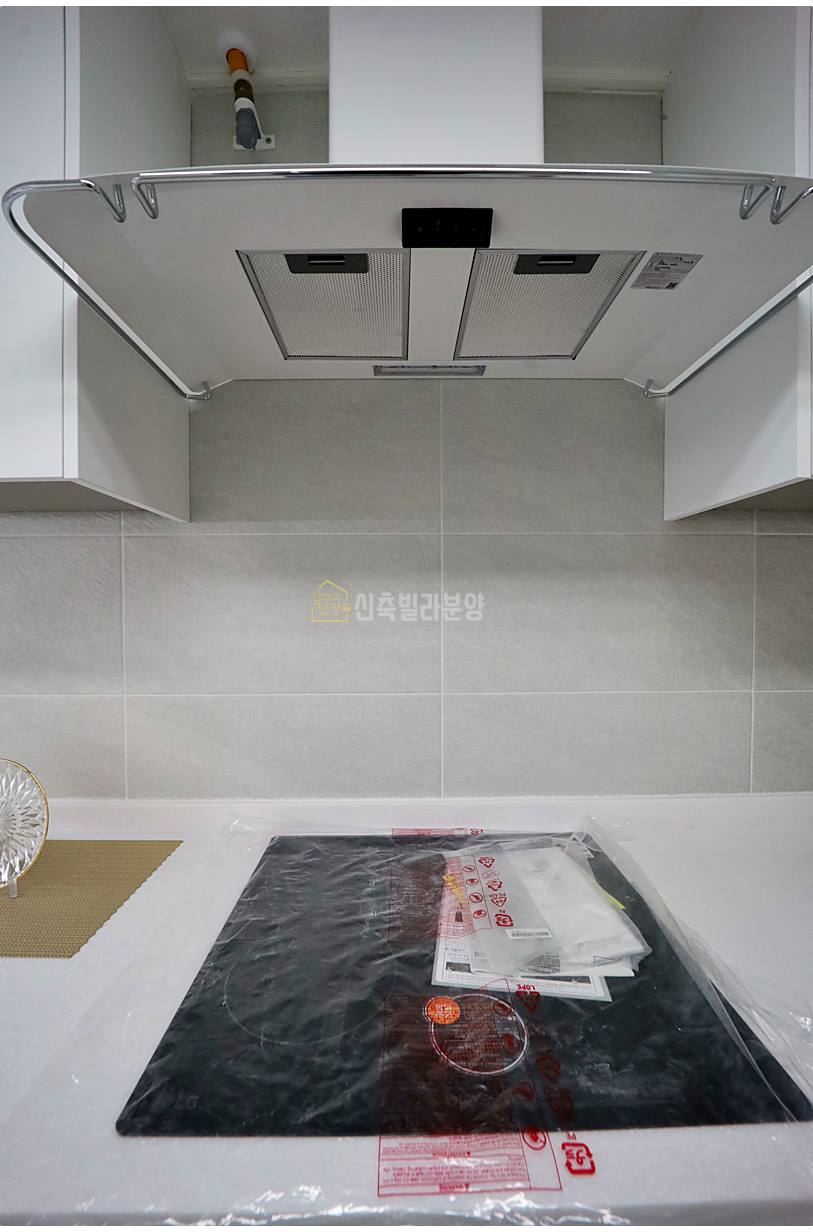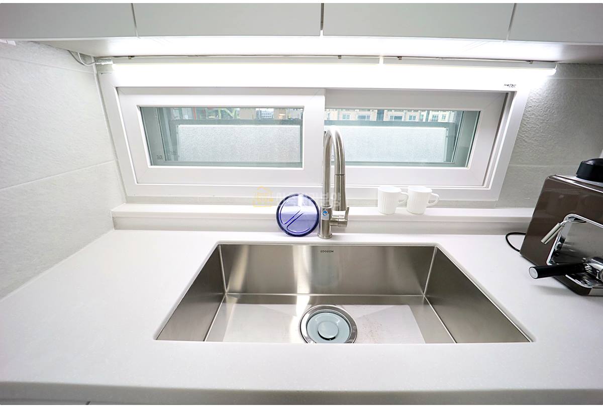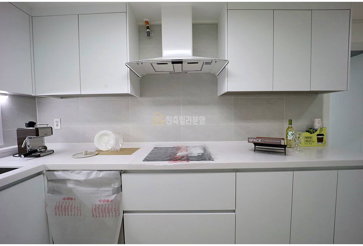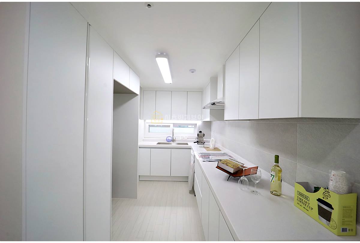 주방은 조리와 수납이 편리한 구조로, 상하부장과 수납 펜트리, 냉장고 매립 공간이 알맞게 배치되어 수납력이 뛰어납니다. 식기세척기와 전기 쿡탑, 넓은 싱크볼까지 기본 구성이 탄탄하며, 환기를 위한 작은창도 마련되어 있습니다.