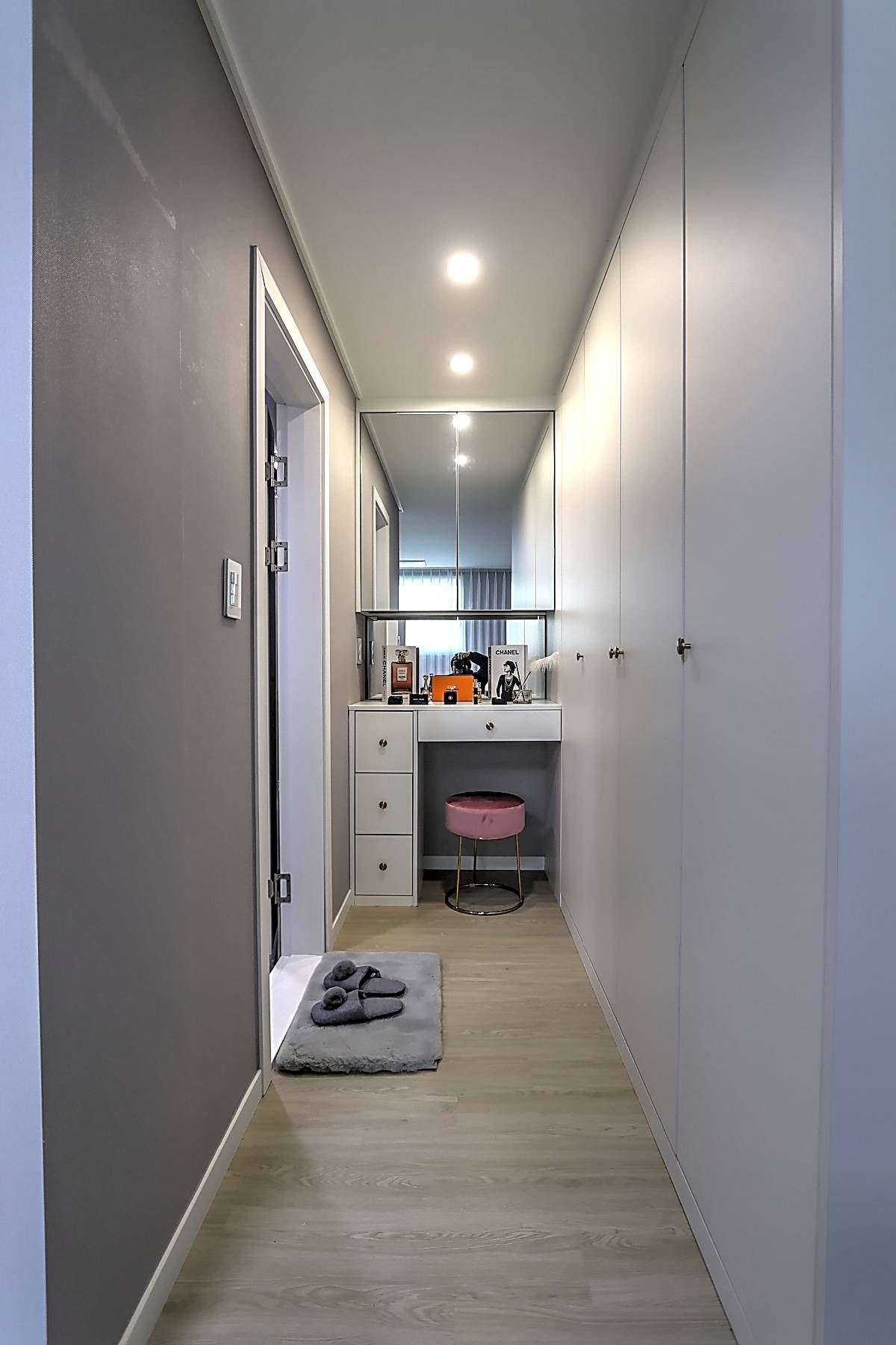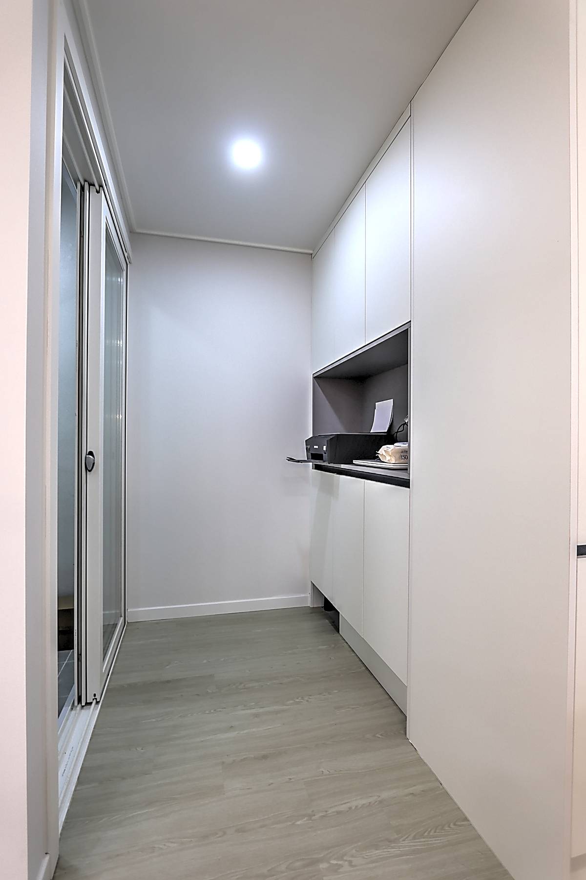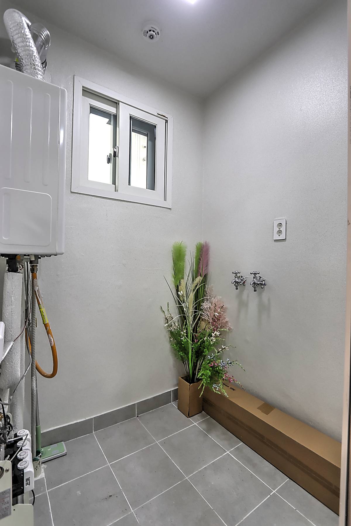 주방 옆에 위치한 다용도실은 이 집의 숨은 보석과도 같습니다. 세탁기와 건조기를 타워형으로 설치하고도 여유 공간이 충분하여 김치냉장고를 추가로 두거나 팬트리 공간으로 활용하기에 부족함이 없습니다. 화도IC 인근의 다른 현장들과 비교해봐도 압도적인 공간 효율성을 보여줍니다.