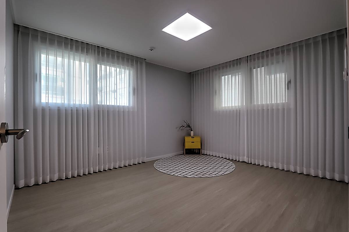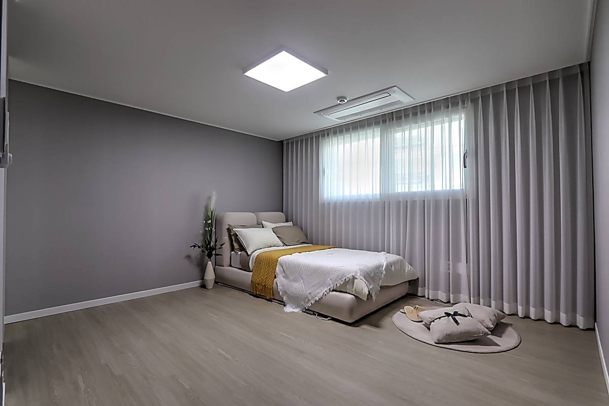 마석신축빌라 3룸욕실2 타입으로 구성된 이 세대의 방들은 하나하나가 메인 룸처럼 널찍하게 나왔습니다. 안방은 약 13자 정도의 가구를 배치할 수 있을 만큼 광활한 크기를 자랑하며, 별도의 파우더룸과 보조 욕실이 연결되어 있어 부부만의 프라이빗한 생활을 보장합니다. 중간 방과 작은 방 또한 일반적인 빌라의 크기를 상회하여, 성인 자녀가 사용하거나 서재, 드레스룸으로 꾸미기에 손색이 없습니다.