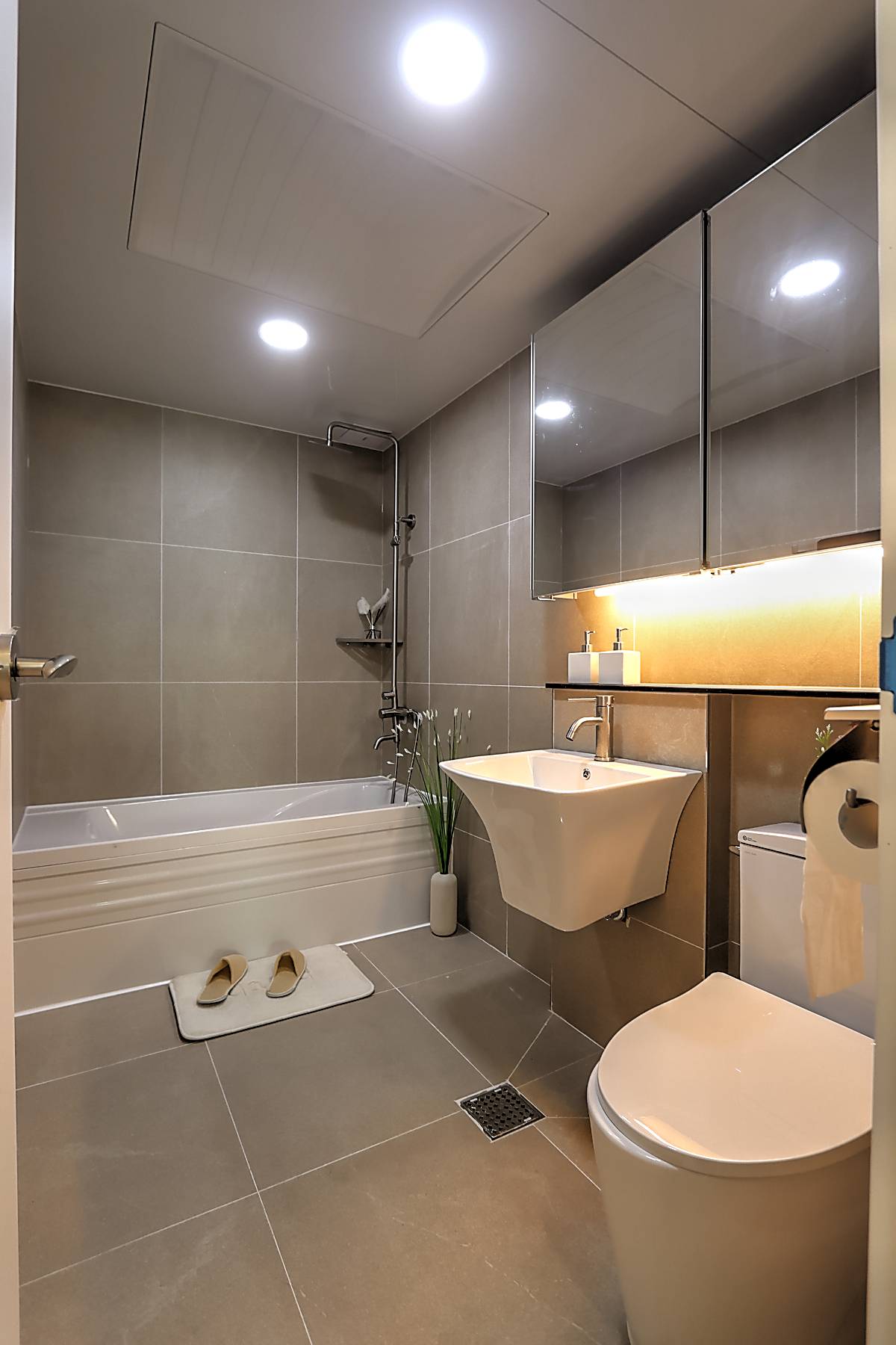 욕실은 총 2개로 구성되어 바쁜 아침 시간에도 가족 구성원 간의 동선 겹침 없이 여유롭게 사용할 수 있습니다. 메인 욕실에는 습기 제거와 곰팡이 방지에 탁월한 환기창이 시공되어 있어 언제나 쾌적함을 유지합니다. 또한 안방 욕실에는 샤워 파티션을 설치해 물 튀김을 방지하고 건식 사용이 가능하도록 배려했습니다.