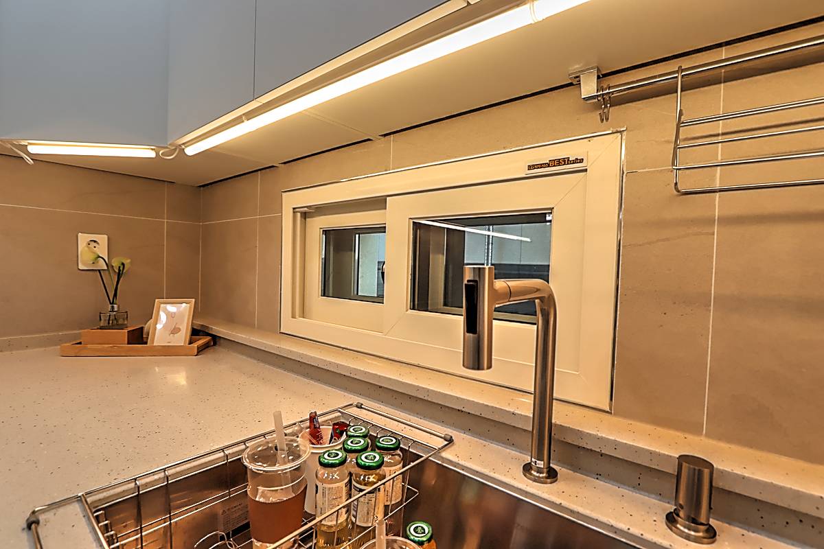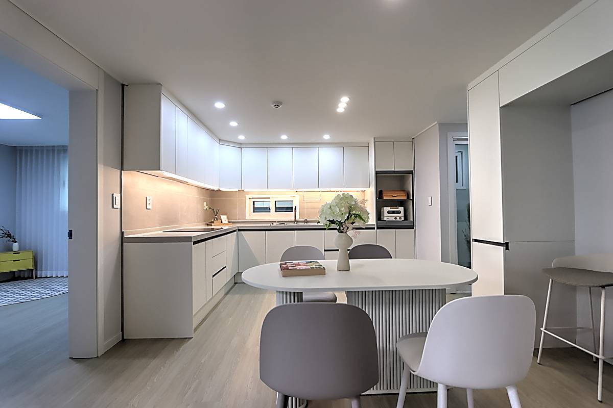 주부님들이 가장 눈여겨보는 주방은 효율적인 ‘ㄱ’자형 구조로 시공되었습니다. 조리 동선을 최소화하면서도 수납공간은 최대로 확보한 센스가 돋보입니다. 4인용 식탁을 놓을 자리가 별도로 마련되어 있으며, 냉장고와 김치냉장고를 나란히 배치할 수 있는 냉장고 박스까지 완비되어 있습니다.