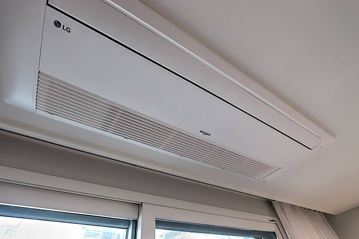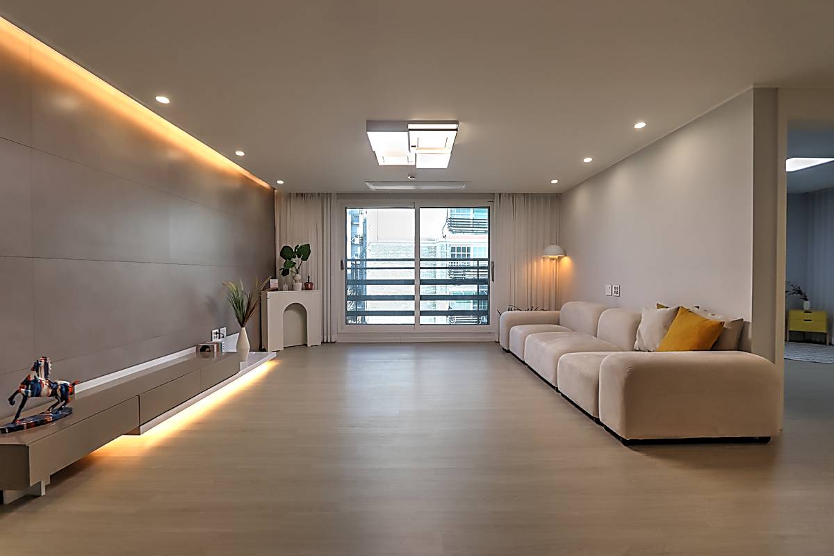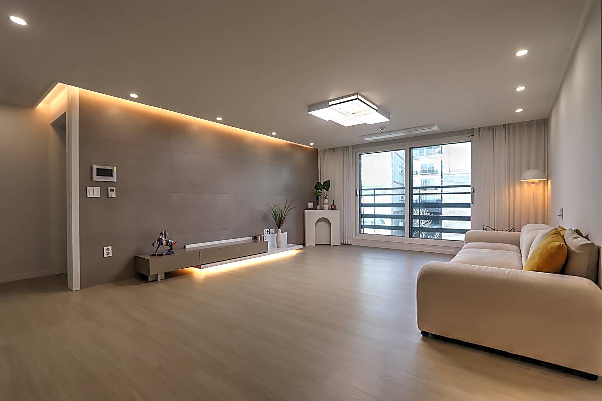 거실은 4인용 소파를 넉넉하게 배치할 수 있을 만큼 광폭 사이즈를 자랑합니다. 천장에는 시스템 에어컨이 기본 옵션으로 매립되어 있어 공간 활용도를 높였으며, 창밖으로 펼쳐지는 막힘없는 뷰는 거주자에게 시각적인 시원함을 선사합니다. 주방과 거실이 마주 보는 대면형 구조는 개방감을 극대화하여 실제 평수보다 훨씬 넓어 보이는 효과를 줍니다.