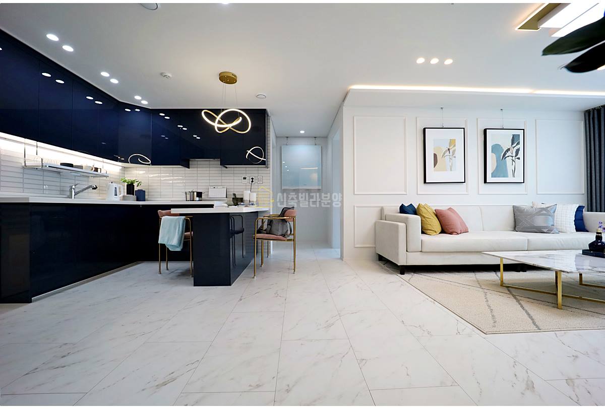 주방은 다크 네이비 컬러로 거실과 대비를 이루며 모던한 분위기를 연출합니다. ㄷ자형 레이아웃은 조리 동선을 최적화했고, 아일랜드 식탁은 높낮이 차이를 두어 공간을 구분했죠. 왼편에는 대형 냉장고를 수납할 수 있는 공간이 여유롭게 마련되어 있습니다.