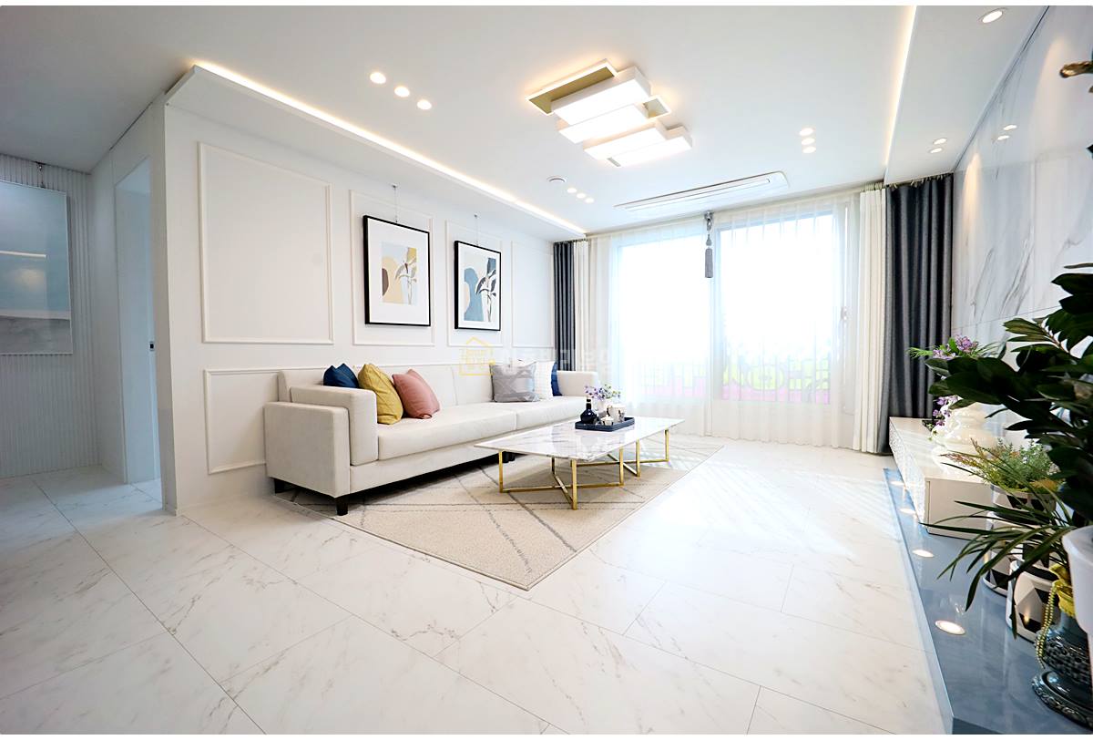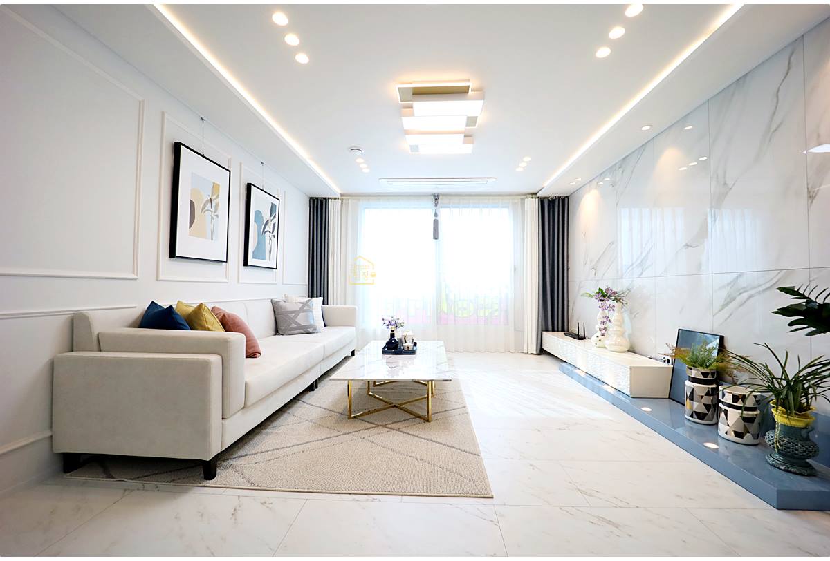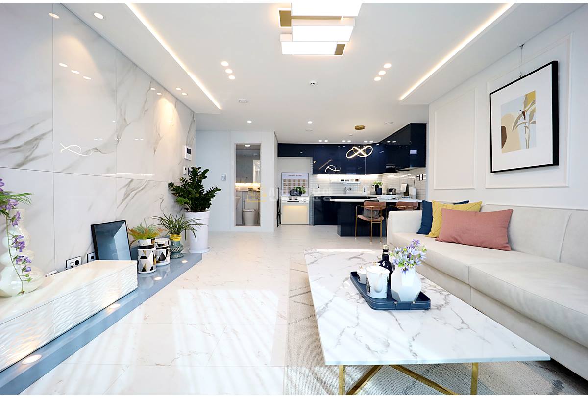 남양주신축빌라 거실에 들어서면 포쉐린 타일과 세련된 아트월의 조화가 눈길을 사로잡습니다. 천장의 레인 조명과 핀 조명은 공간에 입체감을 더하며, 시스템 냉방기가 매립되어 깔끔한 마감을 자랑합니다.