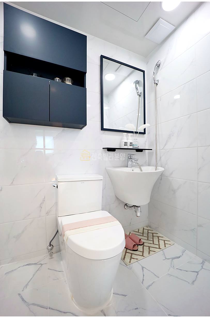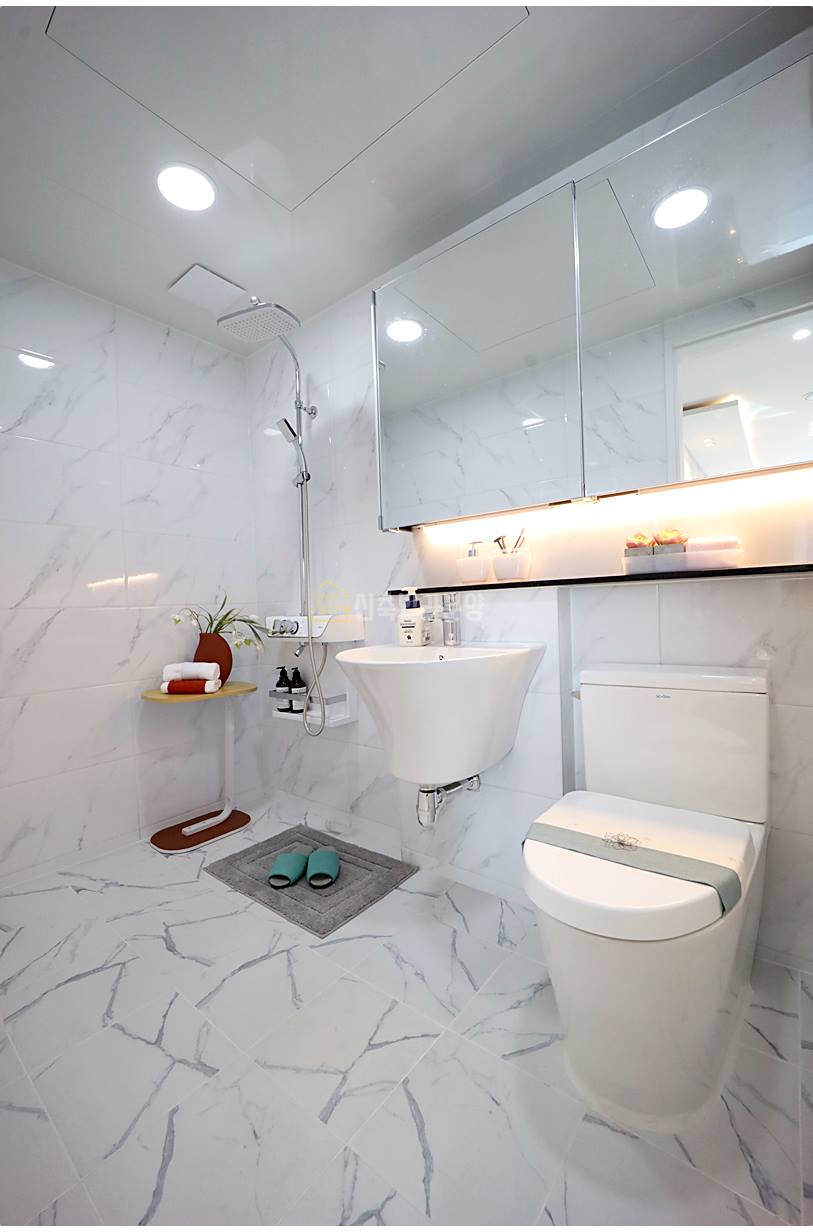 메인 욕실은 환기 시스템과 미러 수납장, 젠다이 선반, 반다리 세면대 등으로 구성되어 기능성과 디자인을 모두 갖췄습니다. 서브 욕실 역시 필수 구성 요소가 완비되어 있어 가족 구성원이 동시에 사용하기 편리합니다.