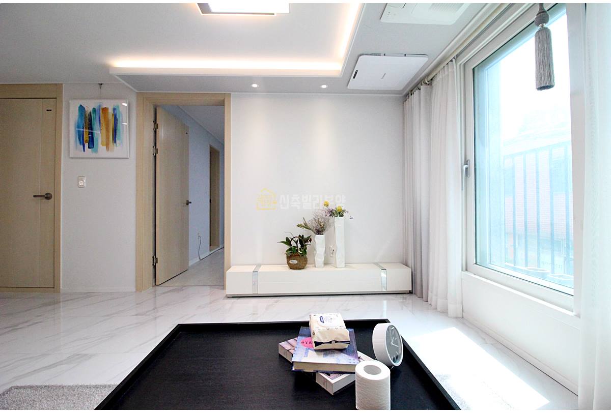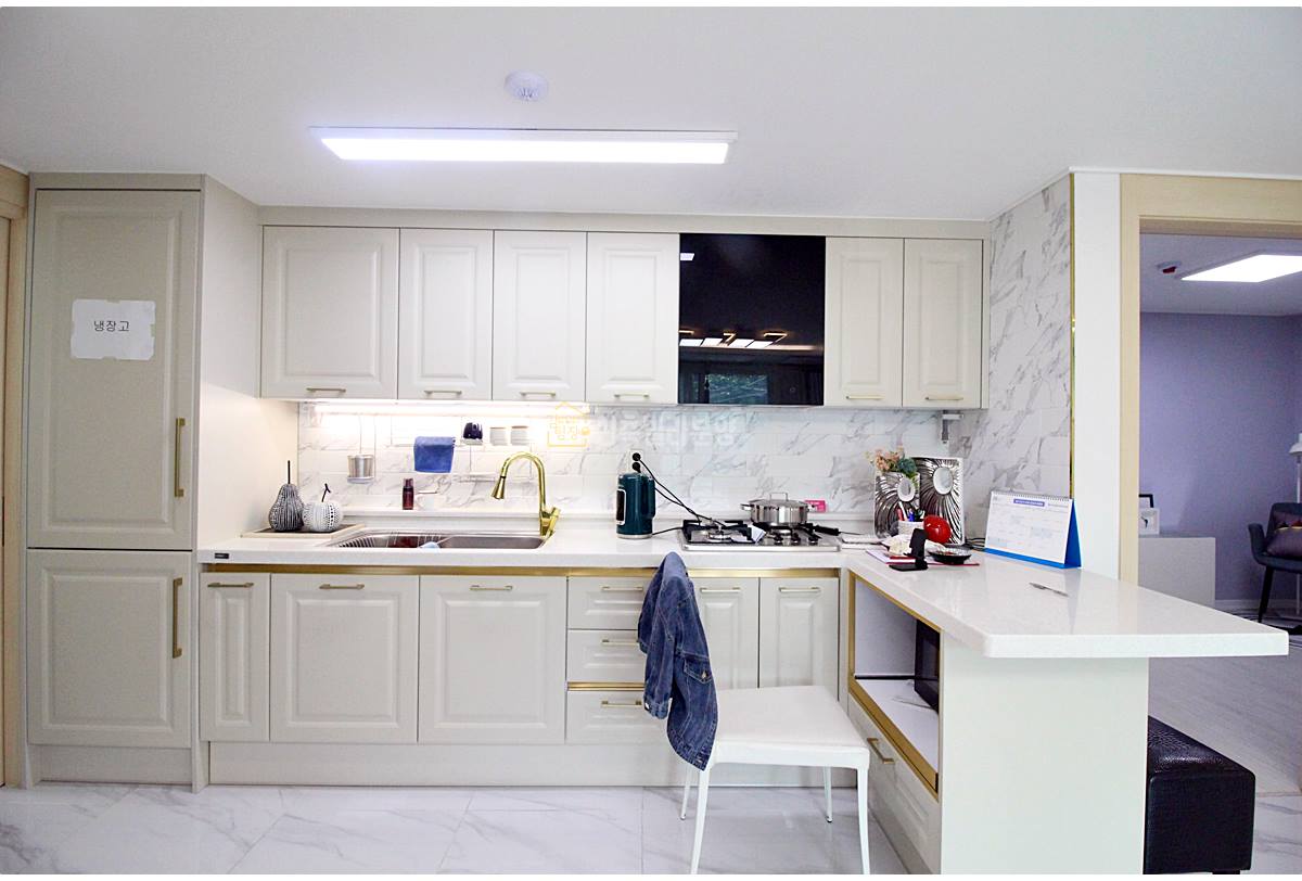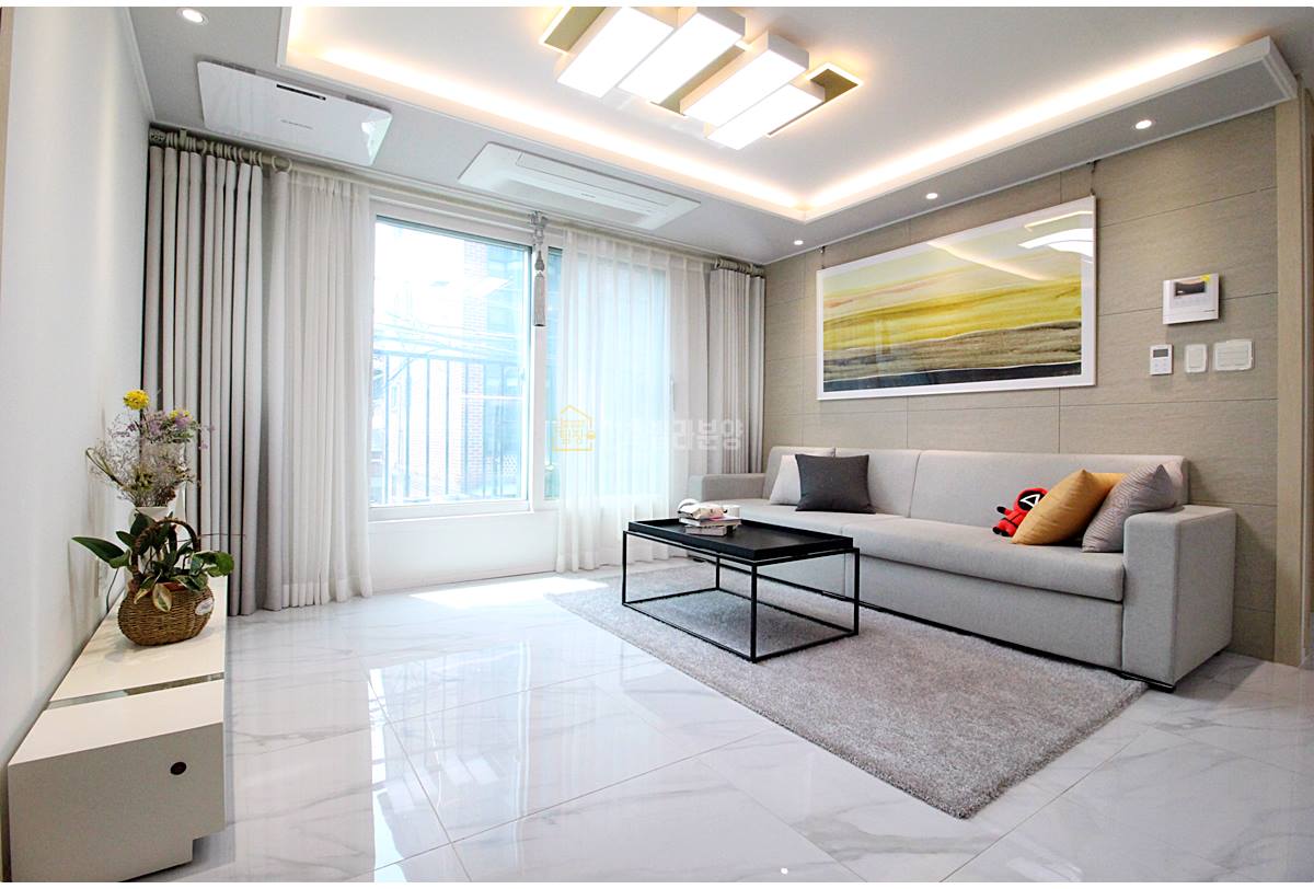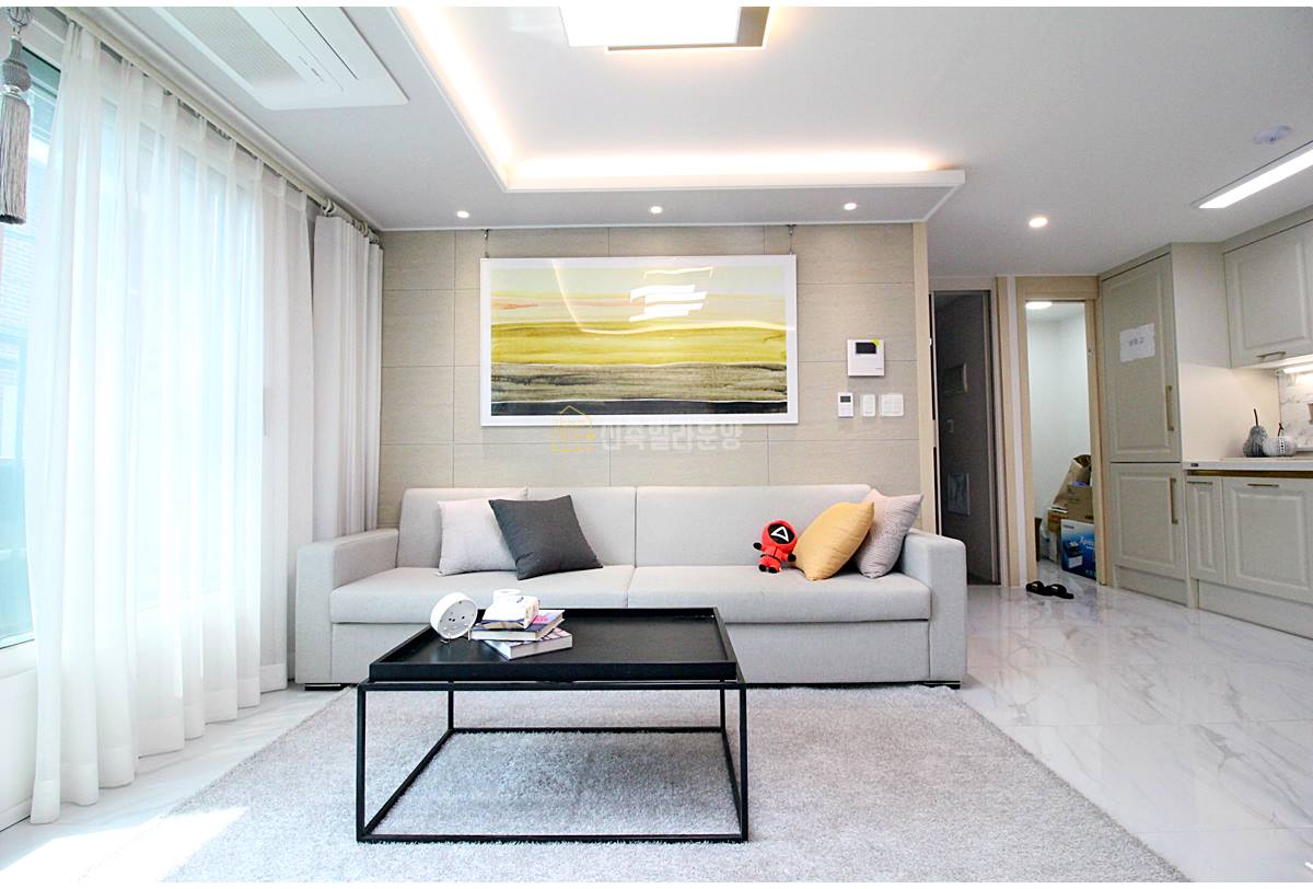 독산동신축빌라 거실은 막힘없는 개방감 있는 구조로 채광이 우수하며, 베이지 컬러의 인테리어로 따뜻하고 세련된 분위기를 연출합니다. 천장형 냉방기기와 공기순환시스템이 기본 장착되어 있고, ㄱ자형 주방에는 수납공간이 충분하며 빌트인 냉장고가 설치되어 있습니다.
