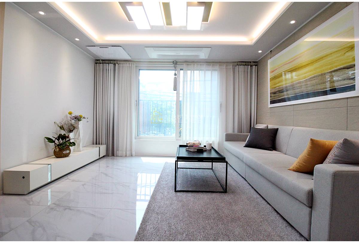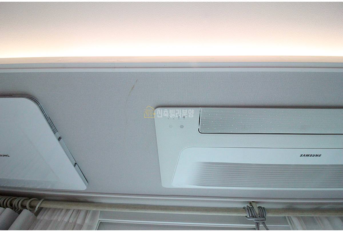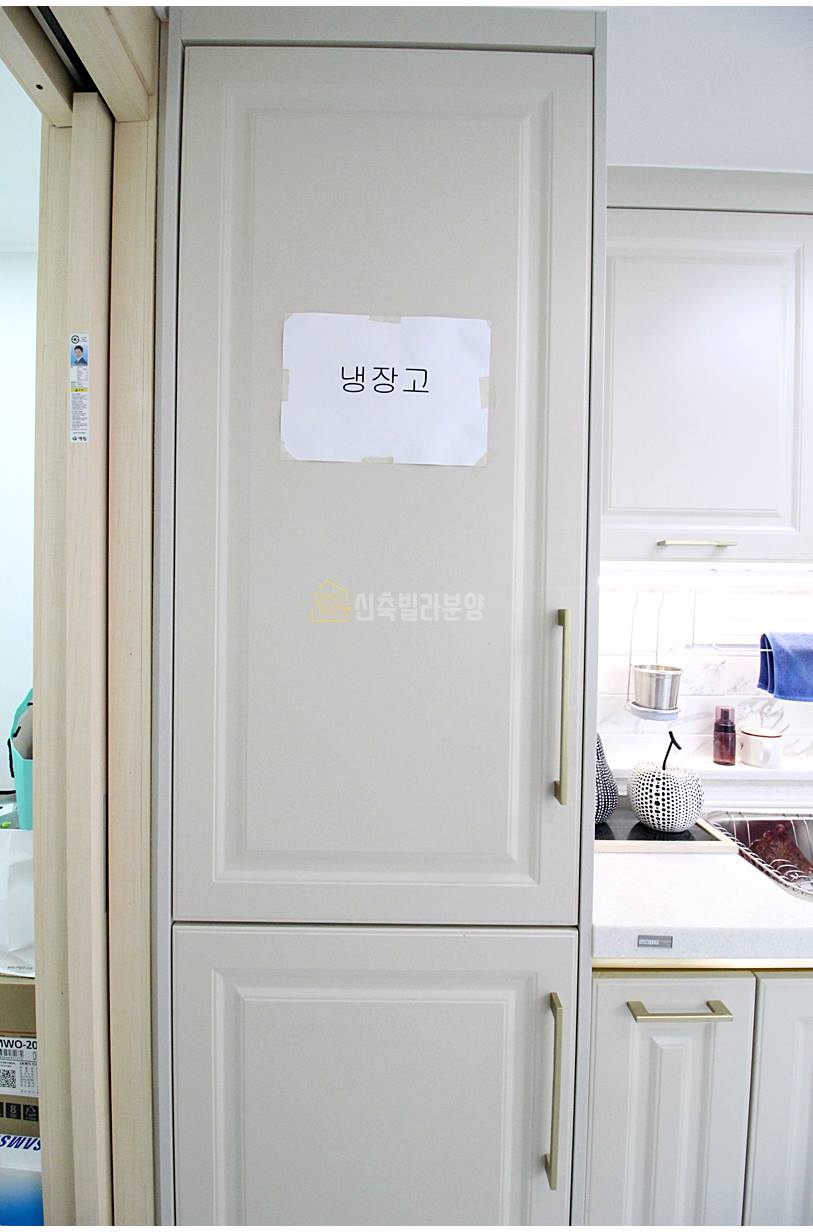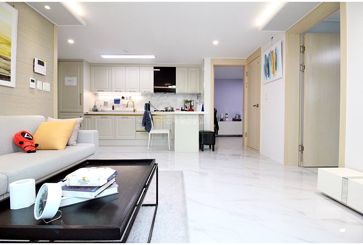 독산동신축빌라 거실은 막힘없는 개방감 있는 구조로 채광이 우수하며, 베이지 컬러의 인테리어로 따뜻하고 세련된 분위기를 연출합니다. 천장형 냉방기기와 공기순환시스템이 기본 장착되어 있고, ㄱ자형 주방에는 수납공간이 충분하며 빌트인 냉장고가 설치되어 있습니다.