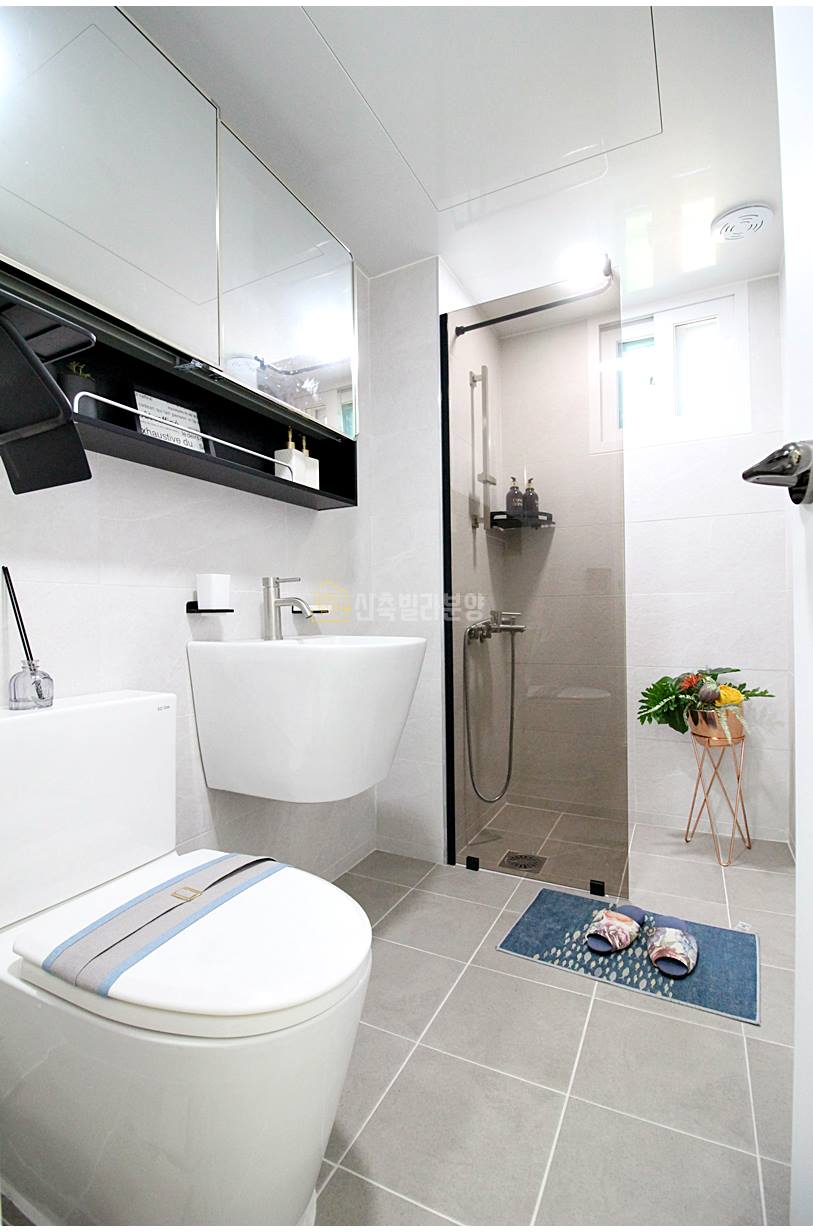 공용 욕실과 부부 욕실 모두 넓은 면적을 확보하고 있으며, 샤워 파티션이 설치되어 있어 물 튀김 걱정 없이 사용할 수 있습니다. 슬라이딩 미러장, 젠다이 선반, 코너장 등 다양한 수납공간이 마련되어 있어 욕실 용품을 깔끔하게 정리할 수 있습니다. 또한 환기창이 설치되어 있어 습기 제거가 용이해 곰팡이 걱정을 덜 수 있습니다.