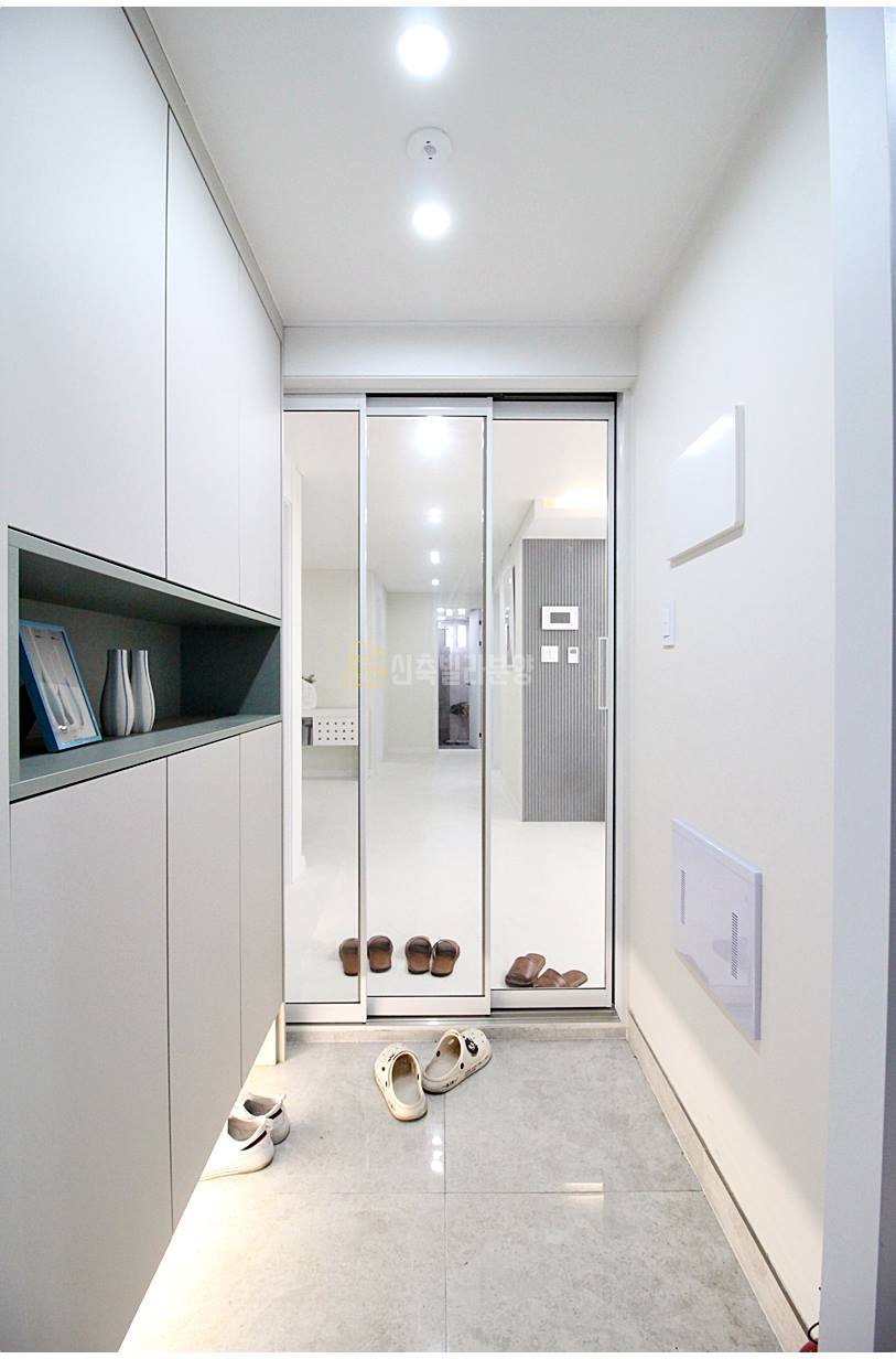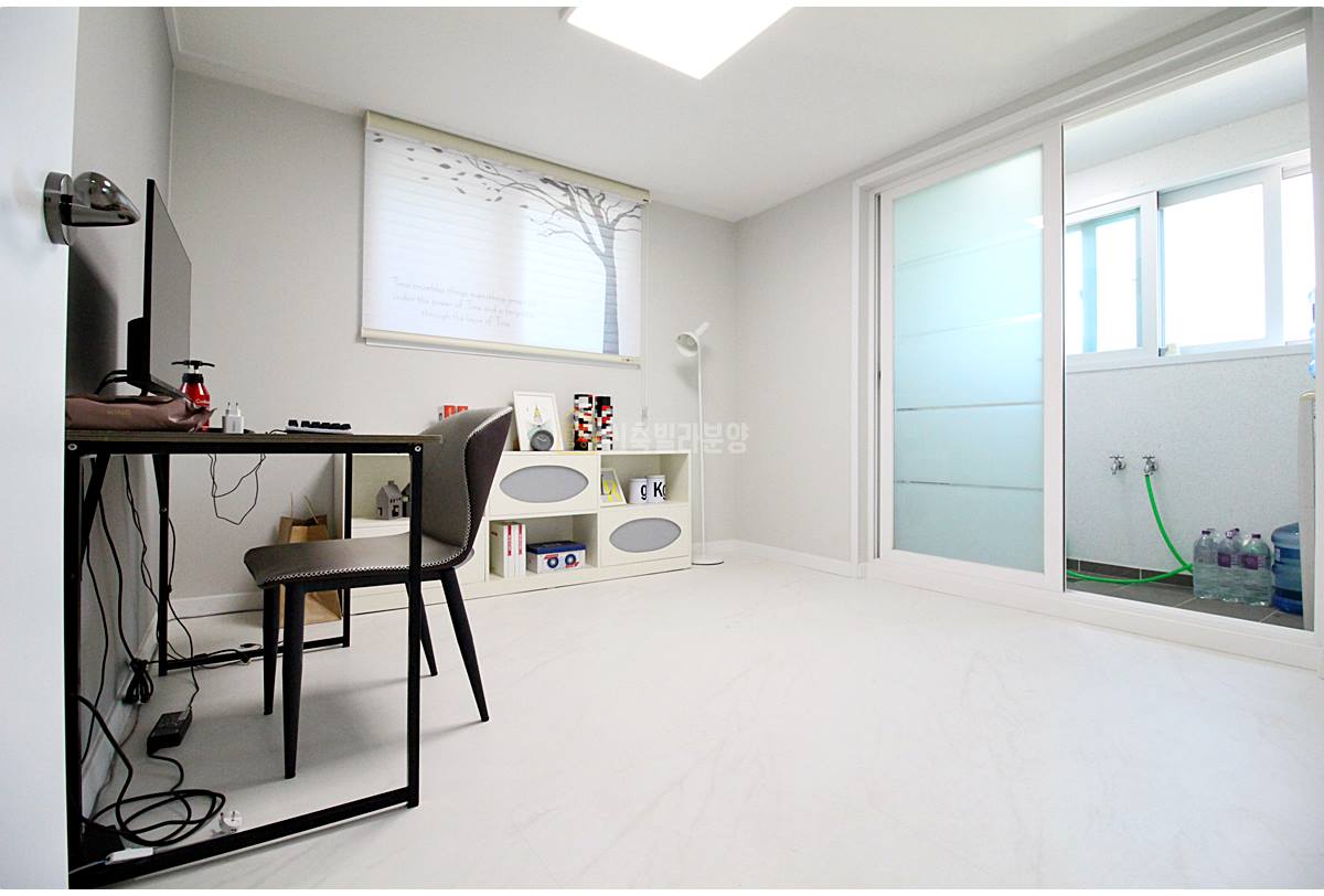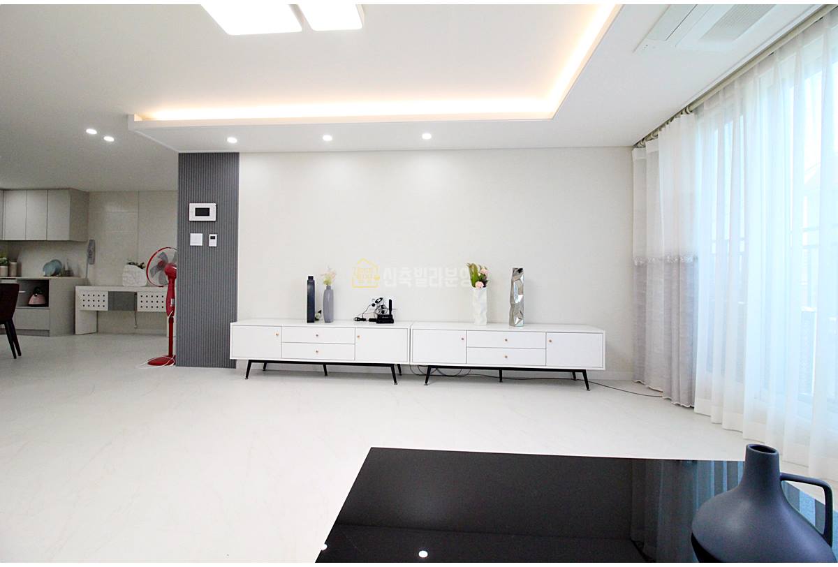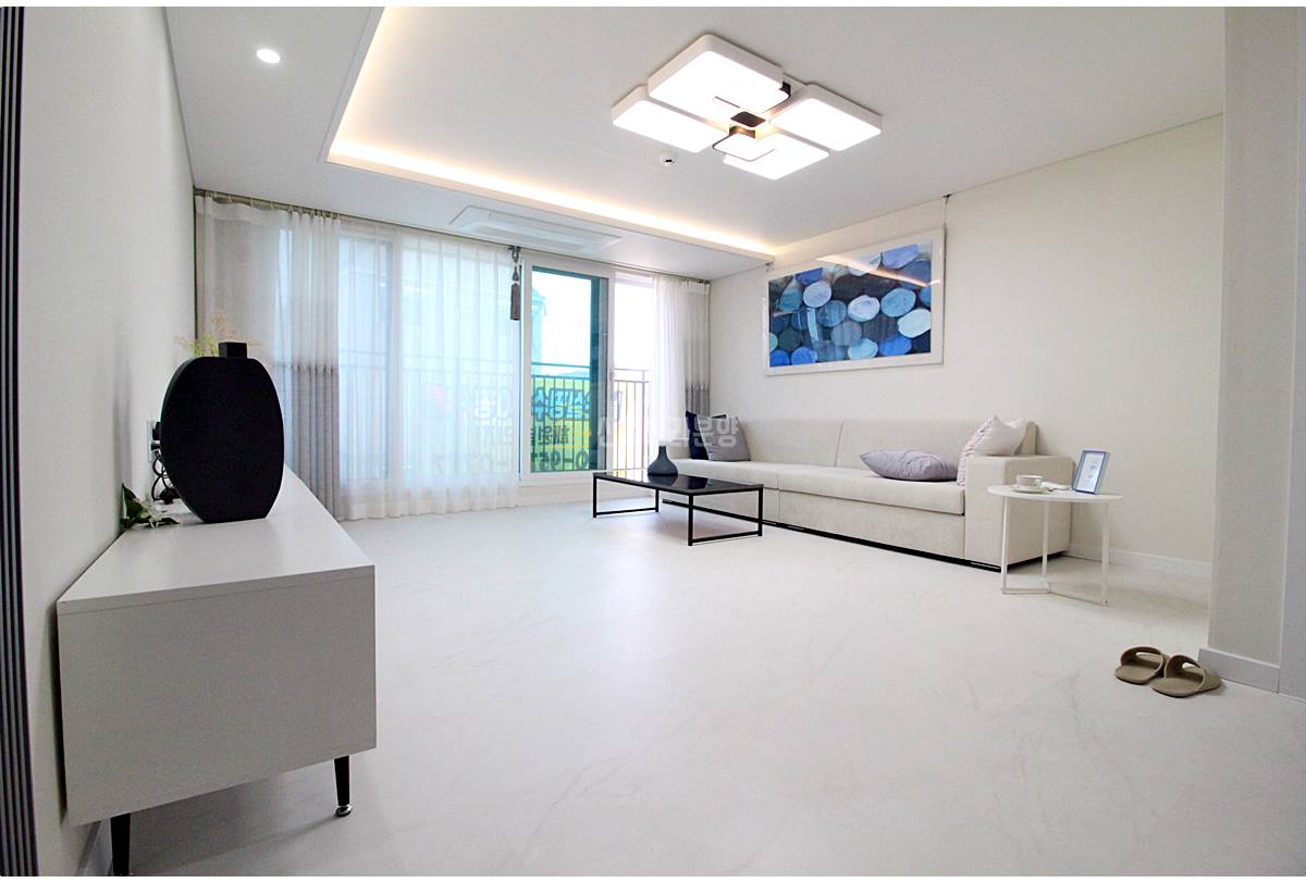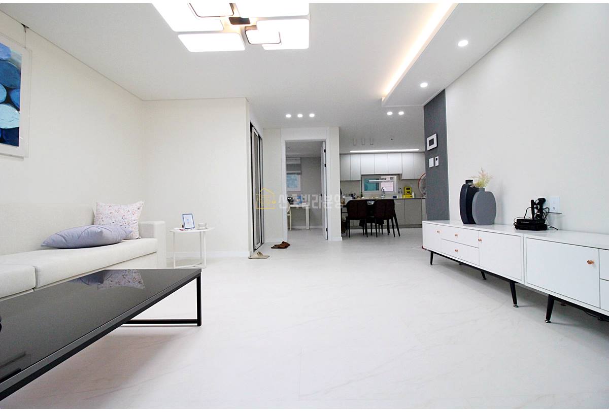 기준층 3룸 타입의 거실은 4인 가족이 함께 모여도 여유로운 크기를 자랑합니다. 4인용 소파와 TV 장식장을 배치하고도 충분한 여유 공간이 확보되어 있어 가족 간의 소통 공간으로 활용하기에 완벽합니다. 화이트톤 인테리어로 마감되어 깔끔하고 모던한 분위기를 연출하며, 바닥은 고급스러운 포셀린 타일로 시공되었습니다.