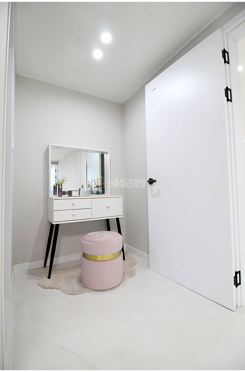 안방에는 별도의 파우더룸 공간이 마련되어 있어 부부만의 프라이빗한 공간 활용이 가능합니다. 침대와 가구를 배치하고도 여유 있는 공간이 확보되며, 중간 크기 침실과 작은 침실도 충분히 넓어 자녀들의 독립적인 공간으로 활용하기에 적합합니다.