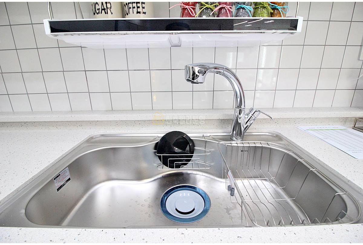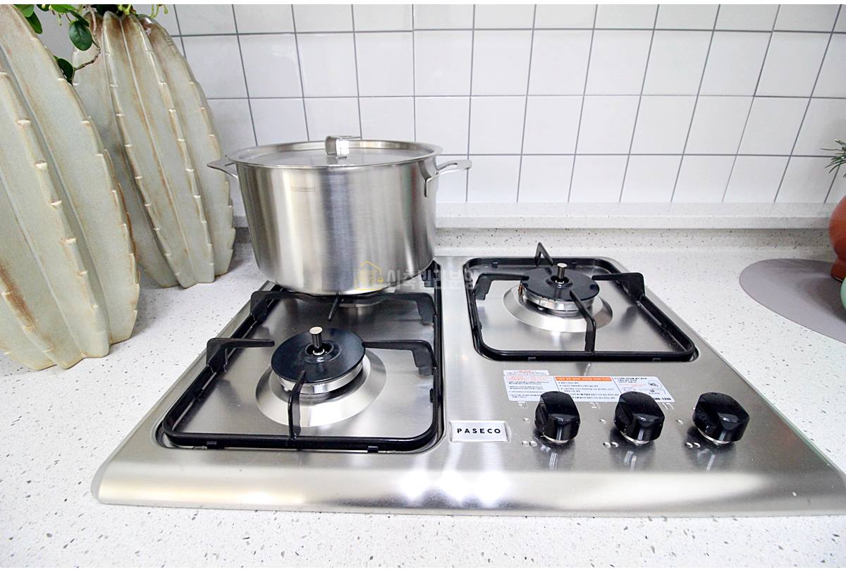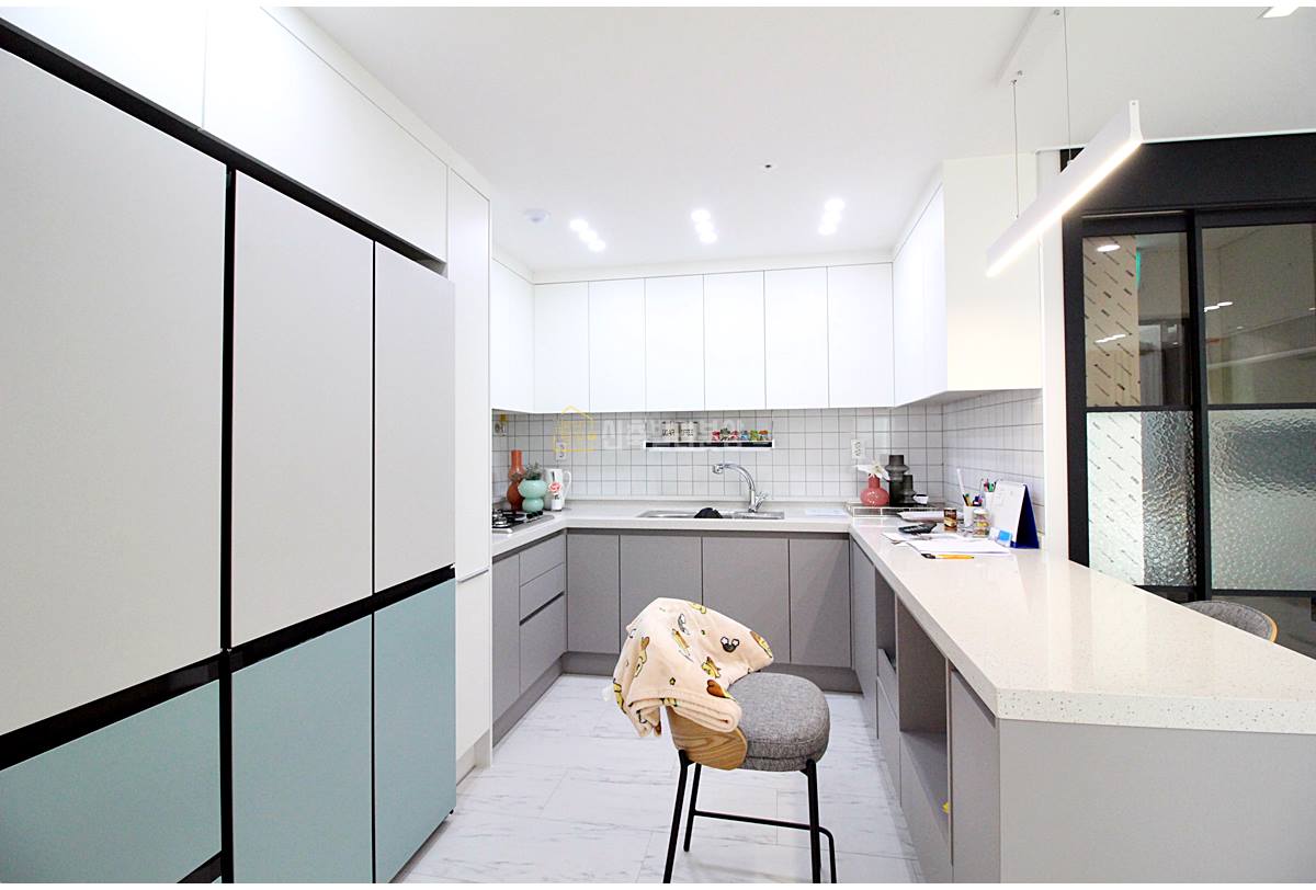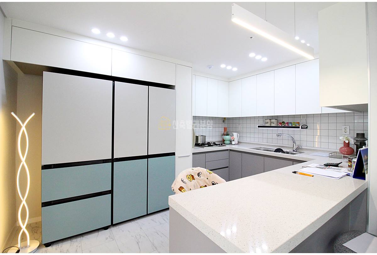 주방은 주부들이 선호하는 ㄷ자 구조로, 상부장과 하부장은 물론 냉장고 전용 공간까지 수납이 넉넉합니다. 냉장고와 김치냉장고가 옵션으로 제공되어 추가 비용 부담 없이 입주할 수 있습니다.