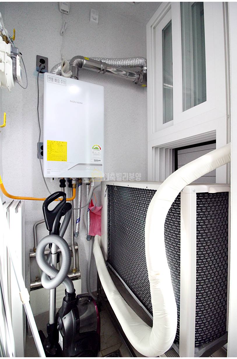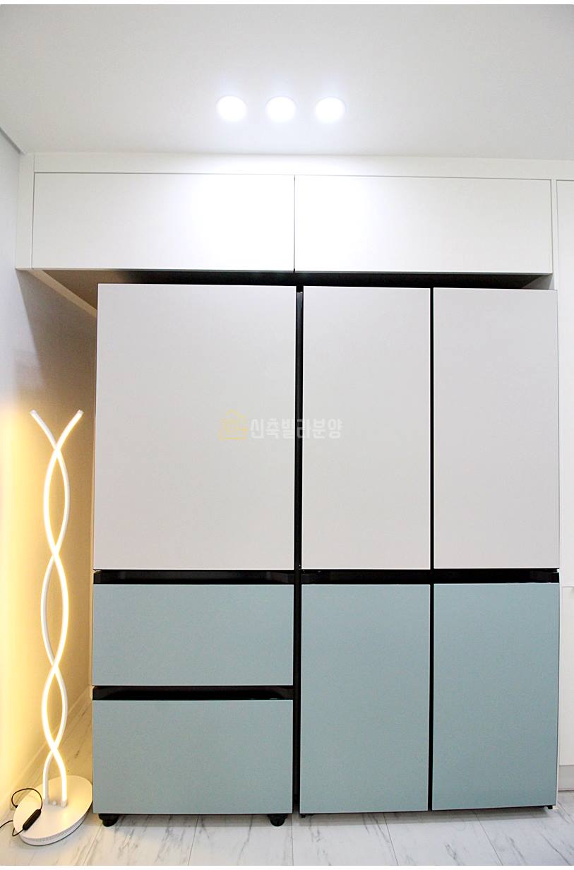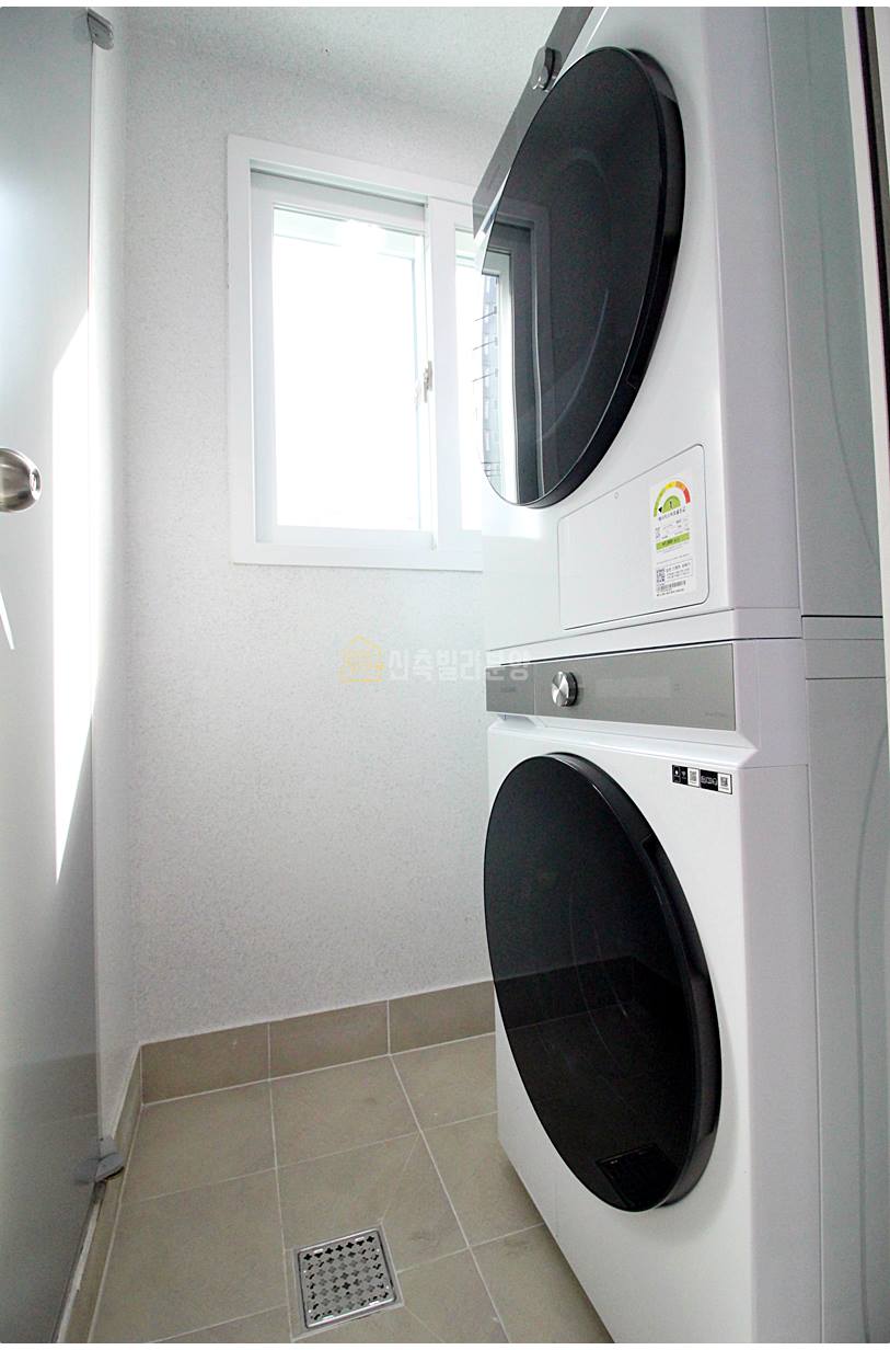 작은방과 연결된 베란다에는 세탁기와 건조기가 옵션으로 설치되어 있습니다. 넓은 현관 공간에는 키큰 신발장이 있으며, 띄움 시공으로 데일리 신발 보관이 편리합니다.
