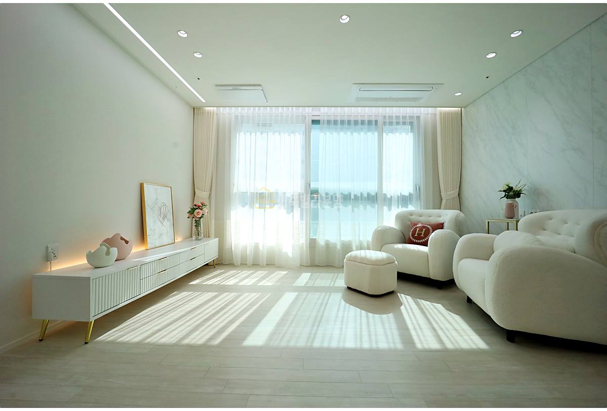 아늑한 무드가 느껴지는 부드러운 감성의 거실은 한낮 채광이 매우 뛰어납니다. 통창 가까이에는 시스템 에어컨과 전열교환기가 시공되어 있으며, 가구 배치 공간도 넉넉합니다.