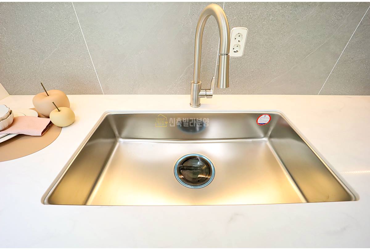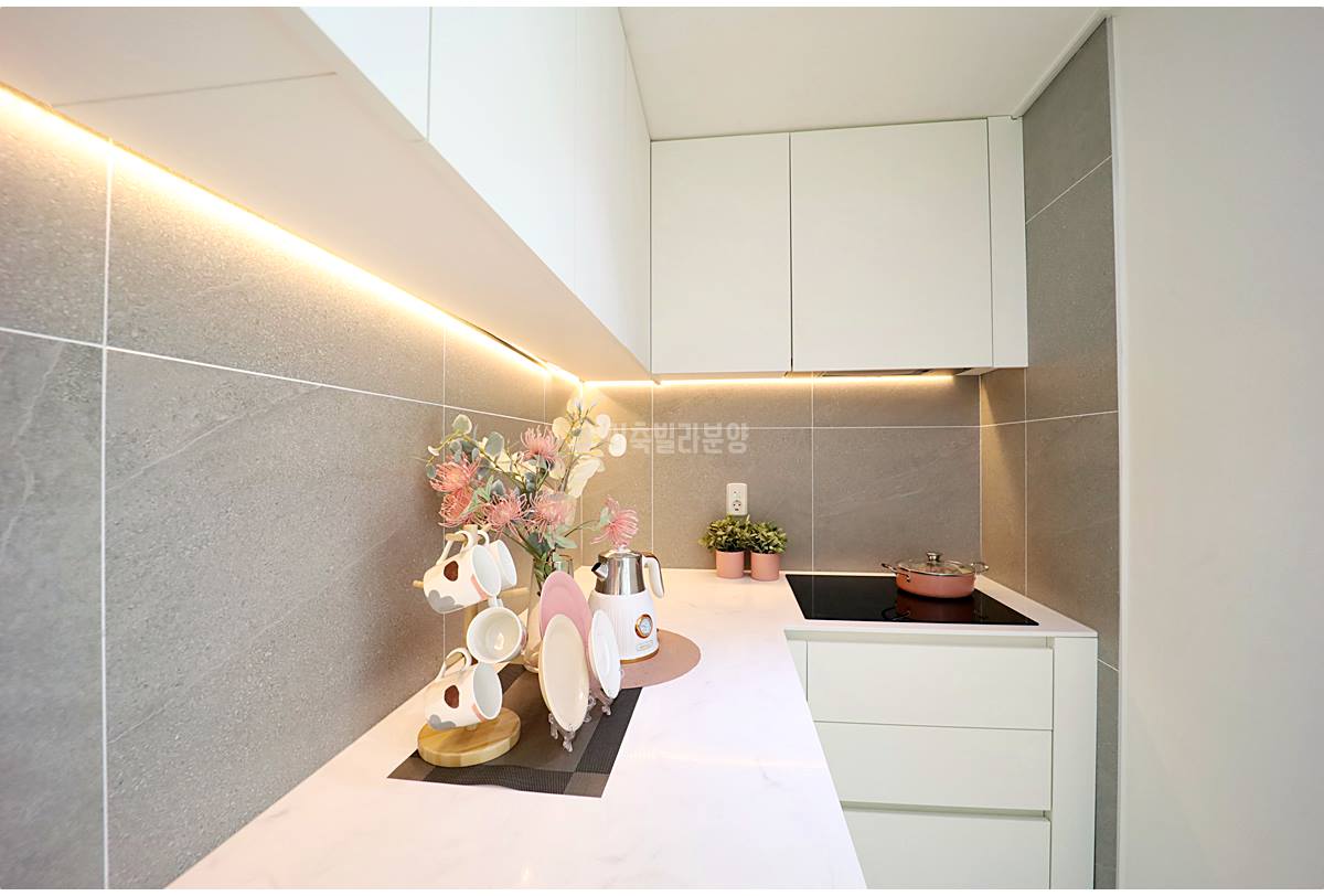 주방은 ㄷ자 구조로 넓게 이루어져 있으며, 냉장고 매립 공간을 여유롭게 확보했습니다. 널널한 상하부장과 넓은 개수대, 전기레인지까지 구성이 잘 완비되어 있습니다.