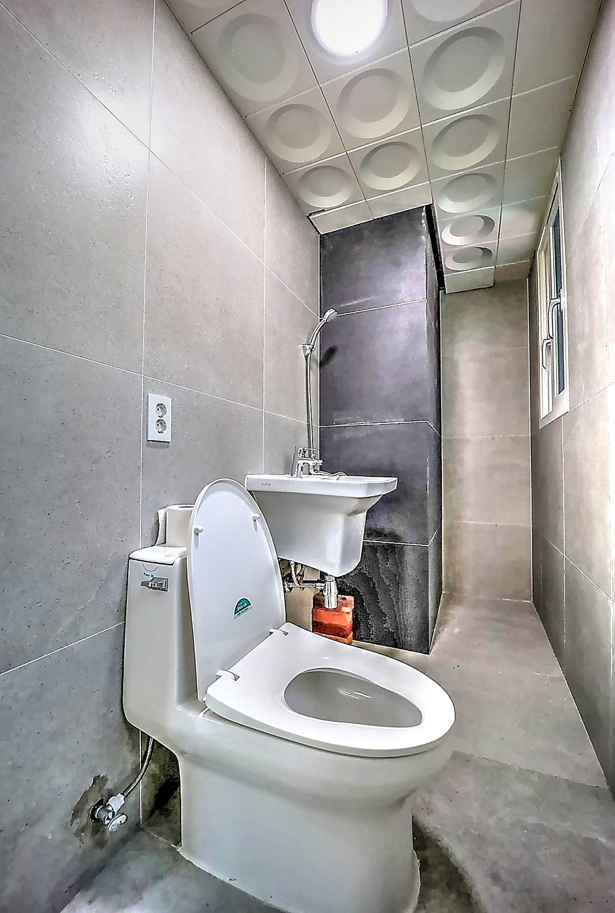 욕실은 그레이 톤 타일로 전체 시공되어 있다. 샤워 공간이 안쪽으로 깊숙이 분리된 구조로, 기본 구성은 완비되어 있다. 오랜 시간 사용해도 질리지 않는 중성적 컬러 선택이 돋보인다.