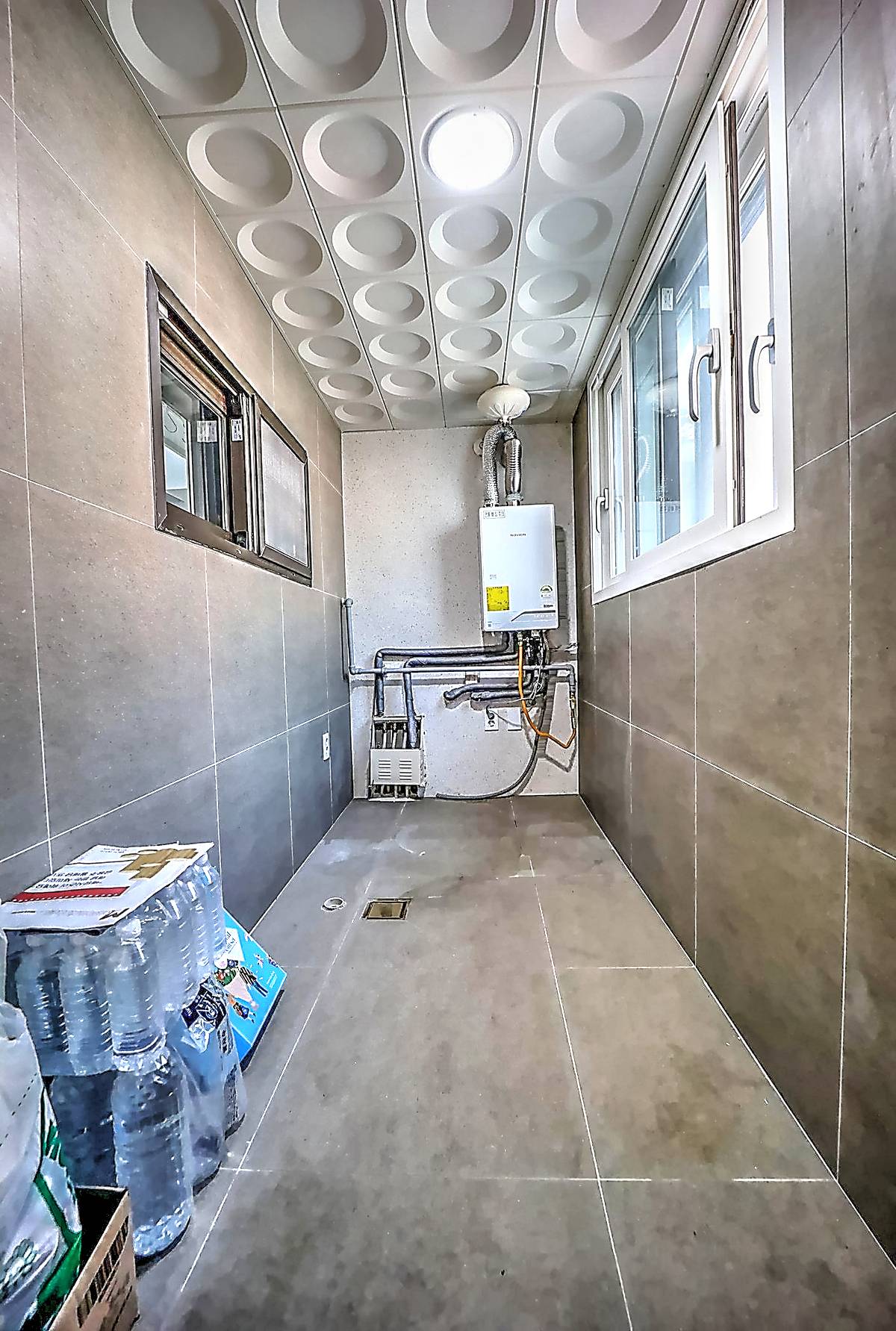 다용도실의 면적이 상당히 넓다. 1등급 보일러가 설치되어 있고, 한쪽으로는 팬트리 공간으로 사용할 수 있을 만큼 여유롭다. 계절 의류나 캠핑 장비 등을 보관하기에 제격이다.