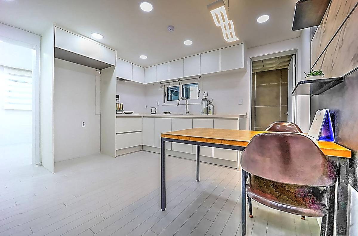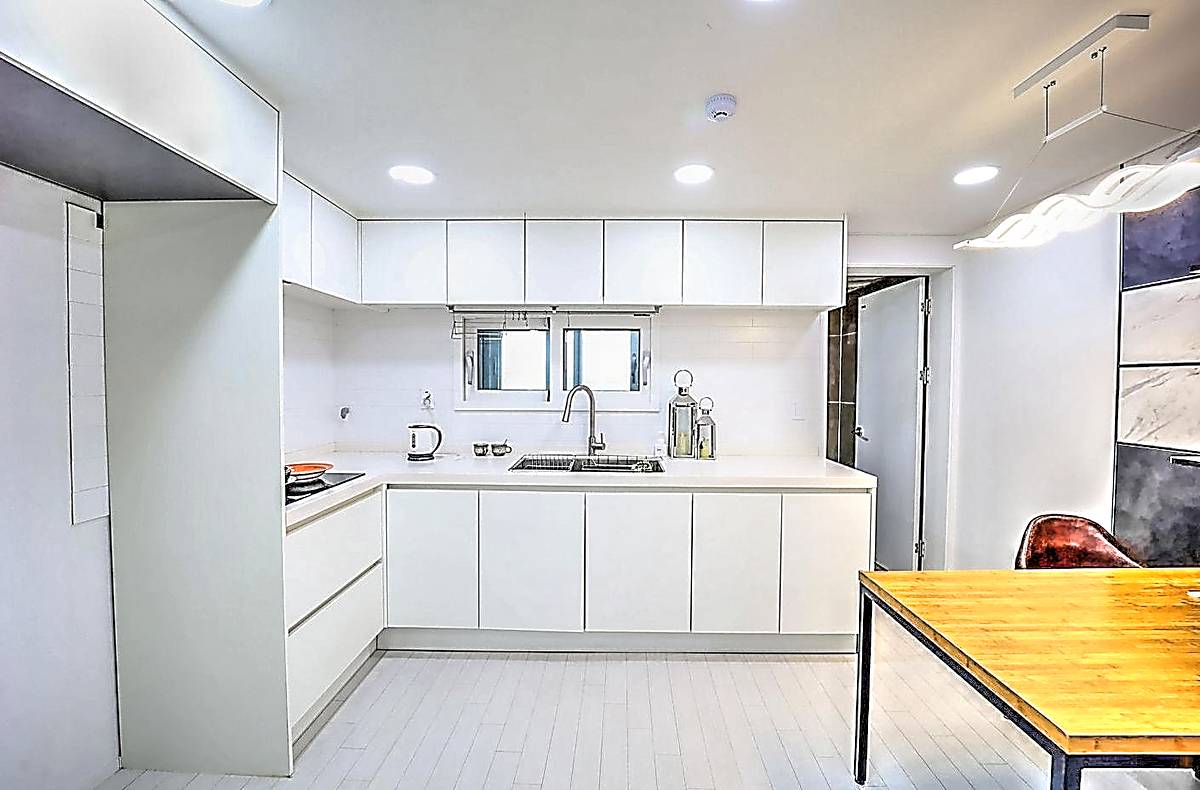 전체적으로 화이트 톤으로 마감되어 화사한 인상을 준다. 천장에 시스템 에어컨이 매립되어 있고, 주방은 ㄱ자 구조로 효율적이다. 냉장고 공간이 별도로 확보되어 있으며, 주방창이 있어 조리 시 환기가 용이하다.