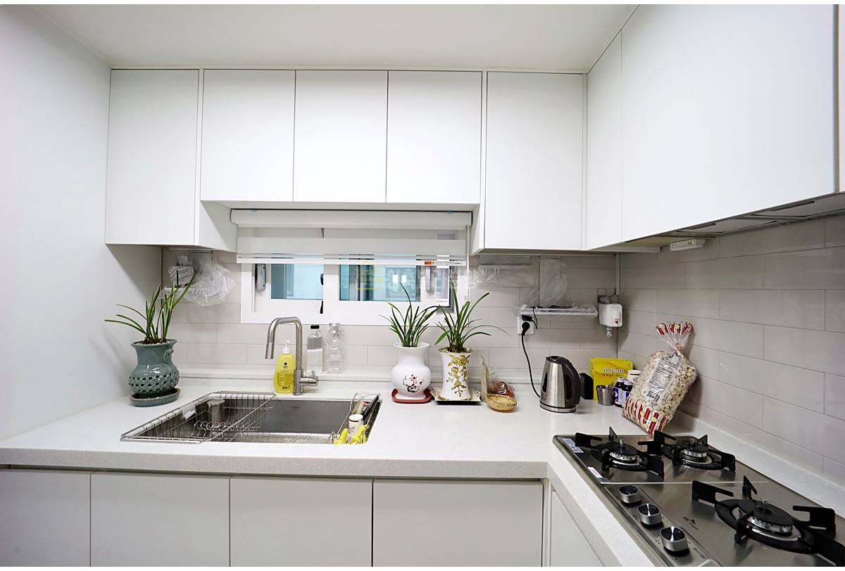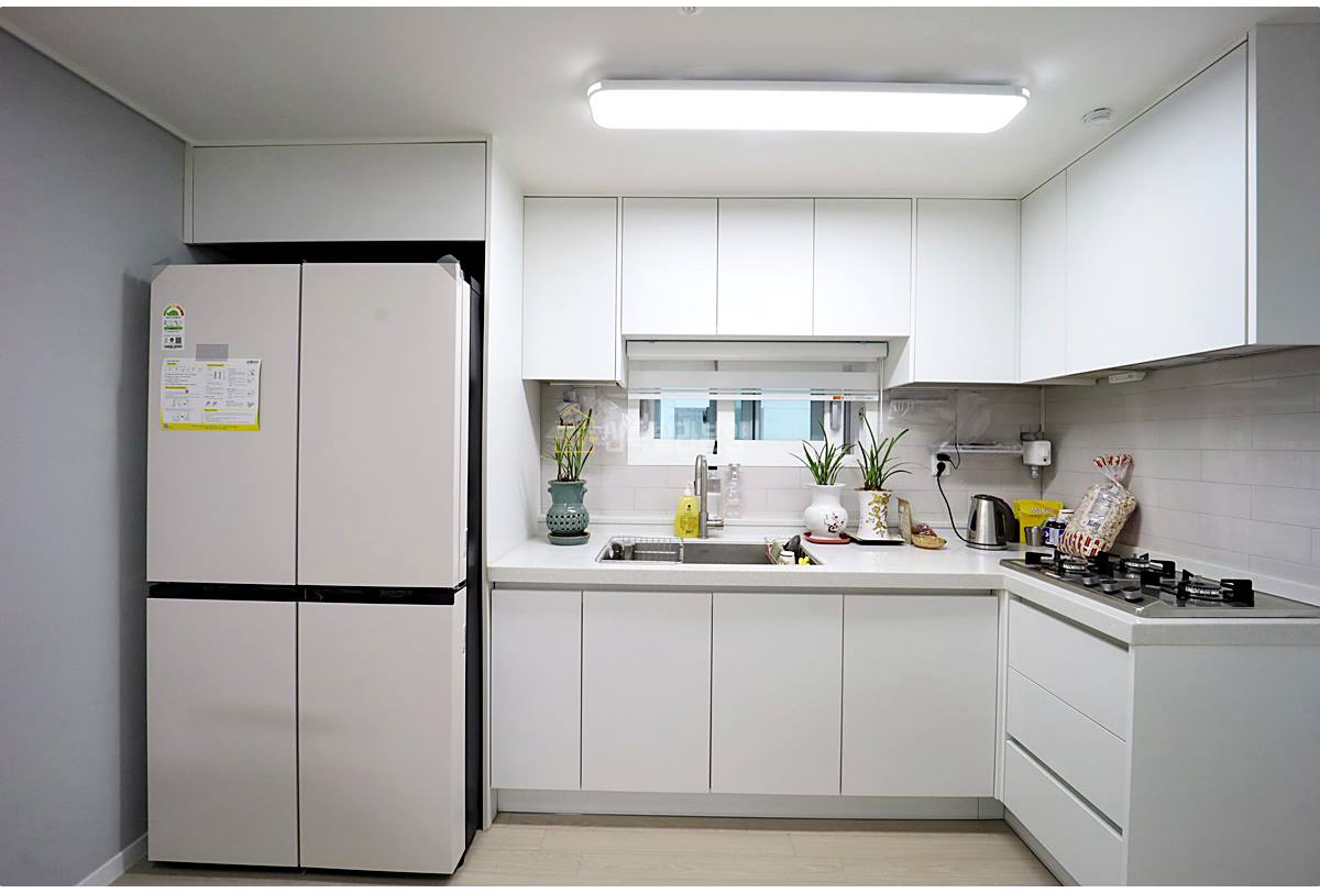 기억자 형태로 디자인된 조리공간은 기본 구성요소가 탄탄하게 갖춰져 있습니다. 다만 넓이가 다소 제한적이라는 점은 참고하시면 좋겠습니다.