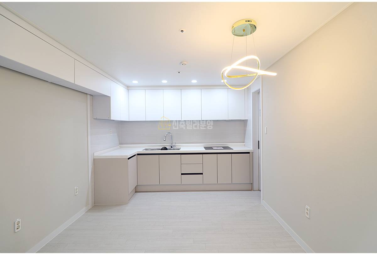 서울신축빌라 기억자 형태로 설계된 조리 공간은 화이트와 베이지 투톤의 상하부 수납장이 넉넉하게 마련되어 있어요. 그런데 진짜 하이라이트는 따로 있답니다. 바로 별도로 구성된 주방 팬트리룸이에요!