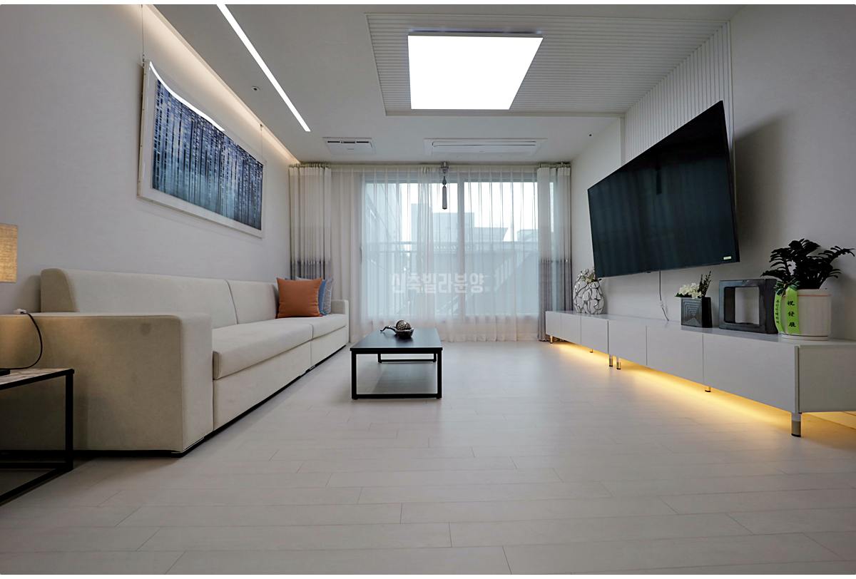 소사본동빌라매매 거실에 들어서면 가장 먼저 눈에 들어오는 건 천장고입니다. 시스템 에어컨과 공기순환기가 기본 설치되어 있고, 라인조명까지 갖춰져 있어 별도 인테리어 비용을 아낄 수 있죠. 4인용 소파와 테이블을 놓아도 TV 시청 거리가 충분하니, 눈 건강 걱정도 덜 수 있습니다.