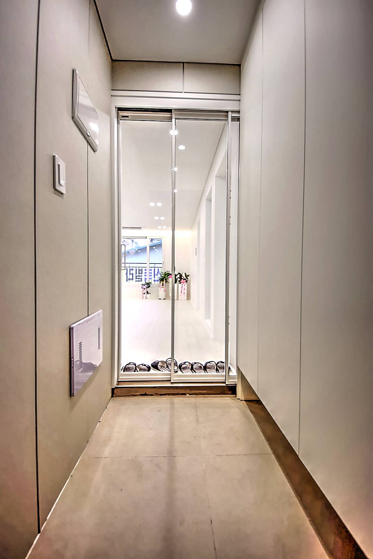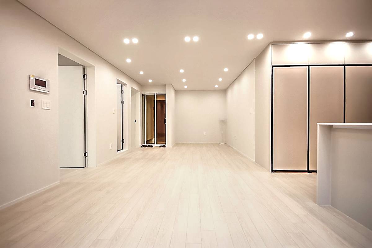 현관 전실 중문 옆에 있는 공간. 지금은 비어 있지만, 이곳에 슬라이딩 도어가 설치됩니다. 이 도어 하나가 23평을 30평처럼 느끼게 만드는 비밀 무기입니다. 필요할 때는 방, 필요 없을 때는 거실 확장. 이보다 더 영리한 공간 활용이 있을까요?