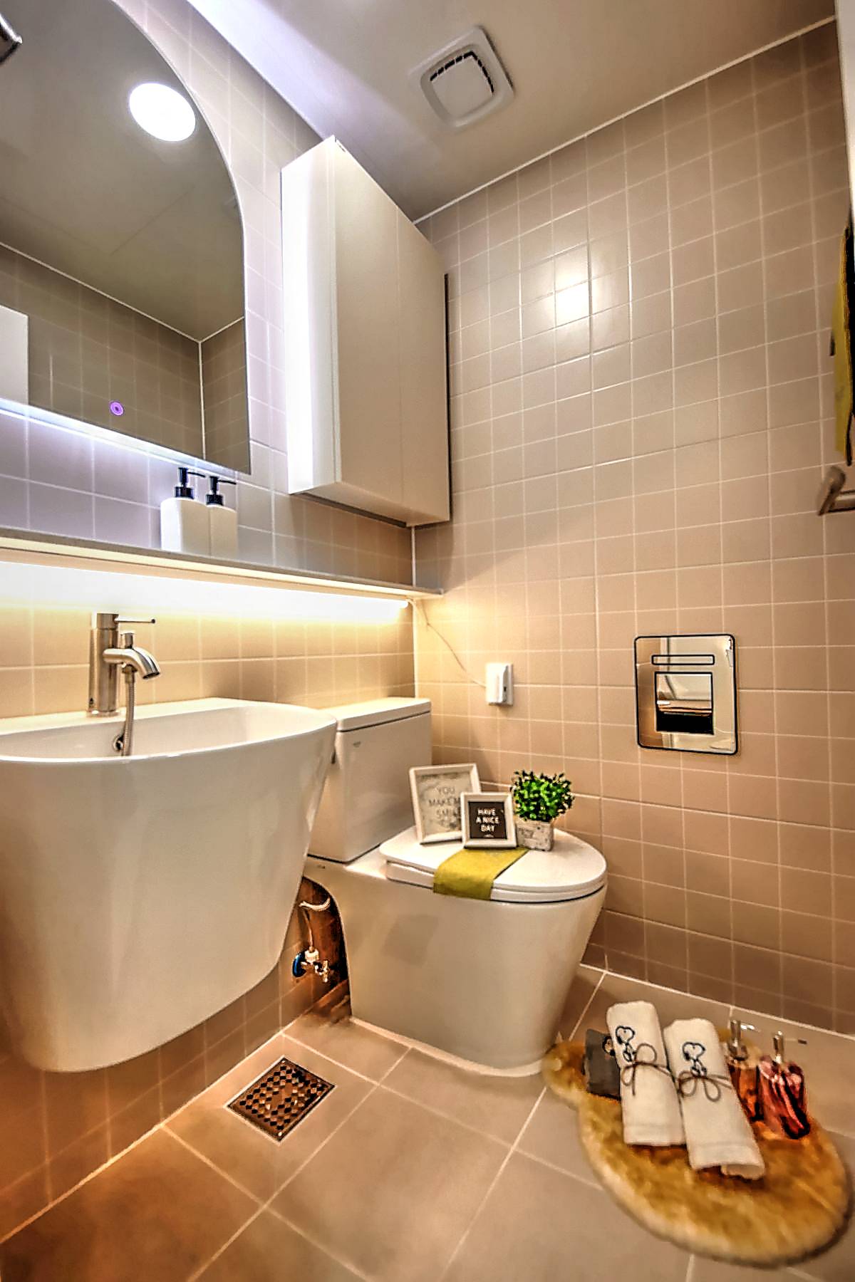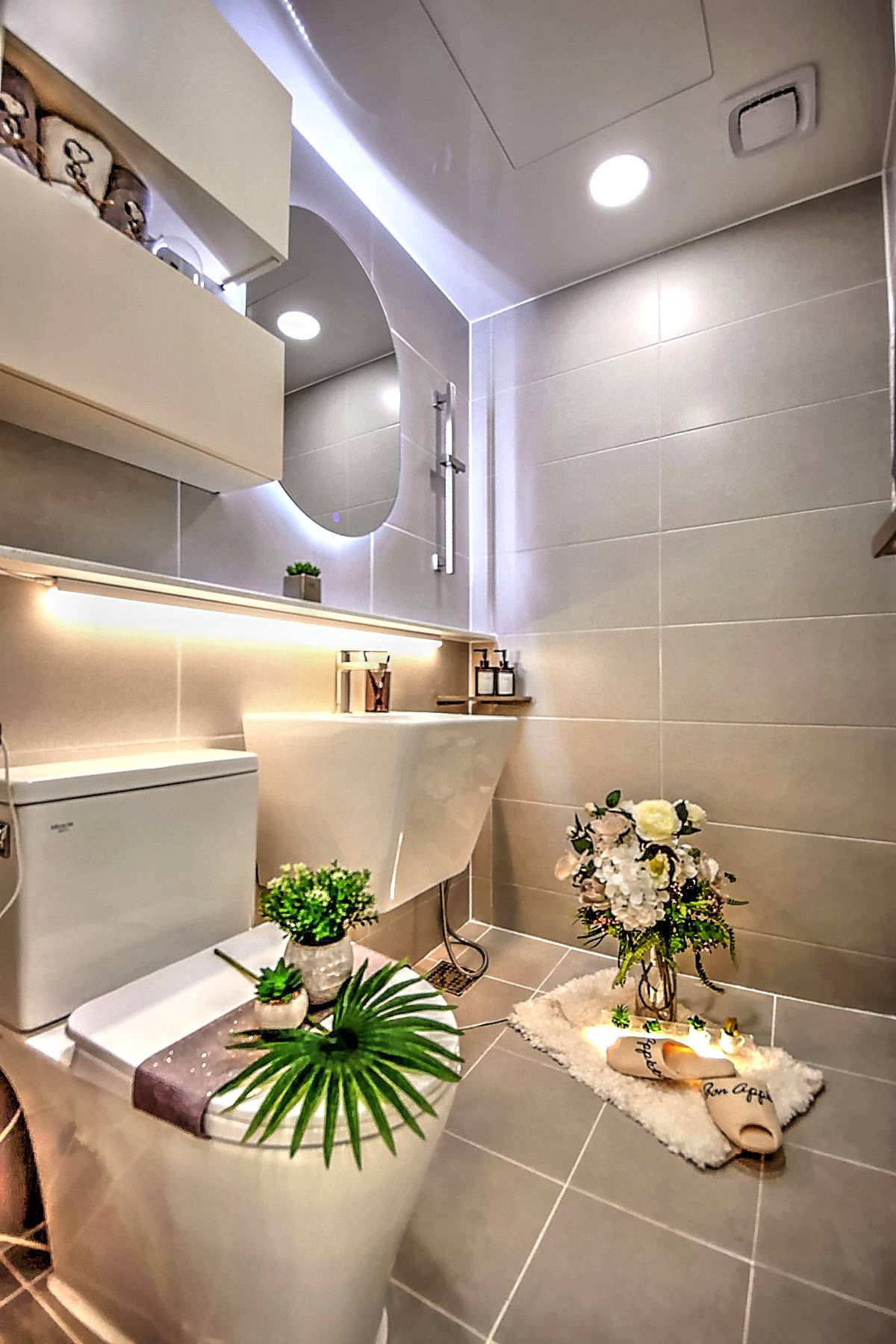 탑동 거실 욕실과 안방 욕실 두 공간 모두 수납장과 젠다이 선반이 시공되어 욕실 용품 정리가 편리합니다. 넓진 않지만 샤워하기엔 충분한 구조이며, 안방 욕실은 조금 협소하지만 바쁜 시간대 동선 분리 용도로는 완벽합니다.