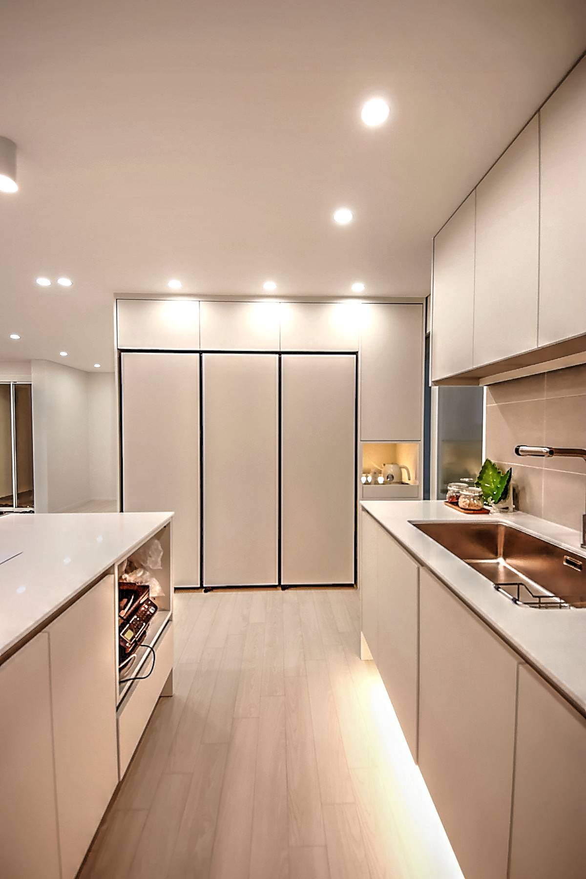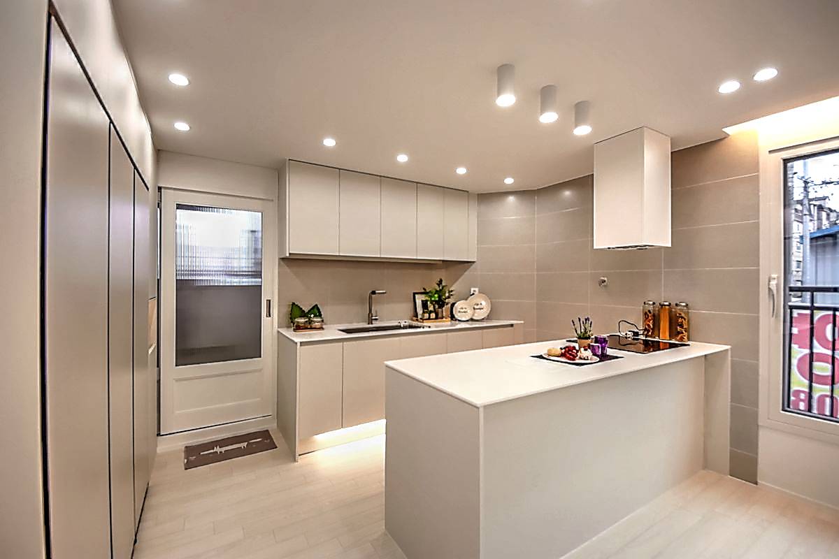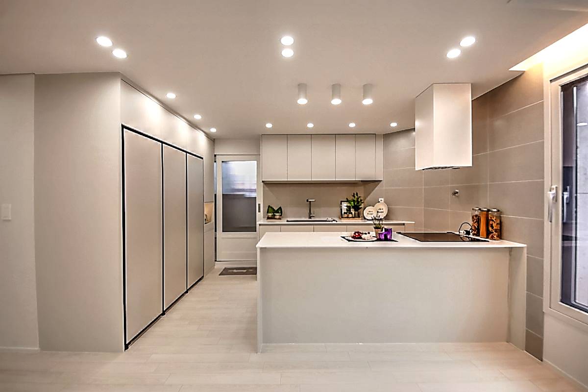 탑동신축빌라 주방을 보는 순간, “이 집 설계자는 요리를 아는 사람이구나” 싶었습니다. 11자 구조의 싱크대에 넓은 아일랜드 식탁까지. 조리대이자 식탁이자 때로는 공부방 책상이 되기도 하는 만능 공간입니다.