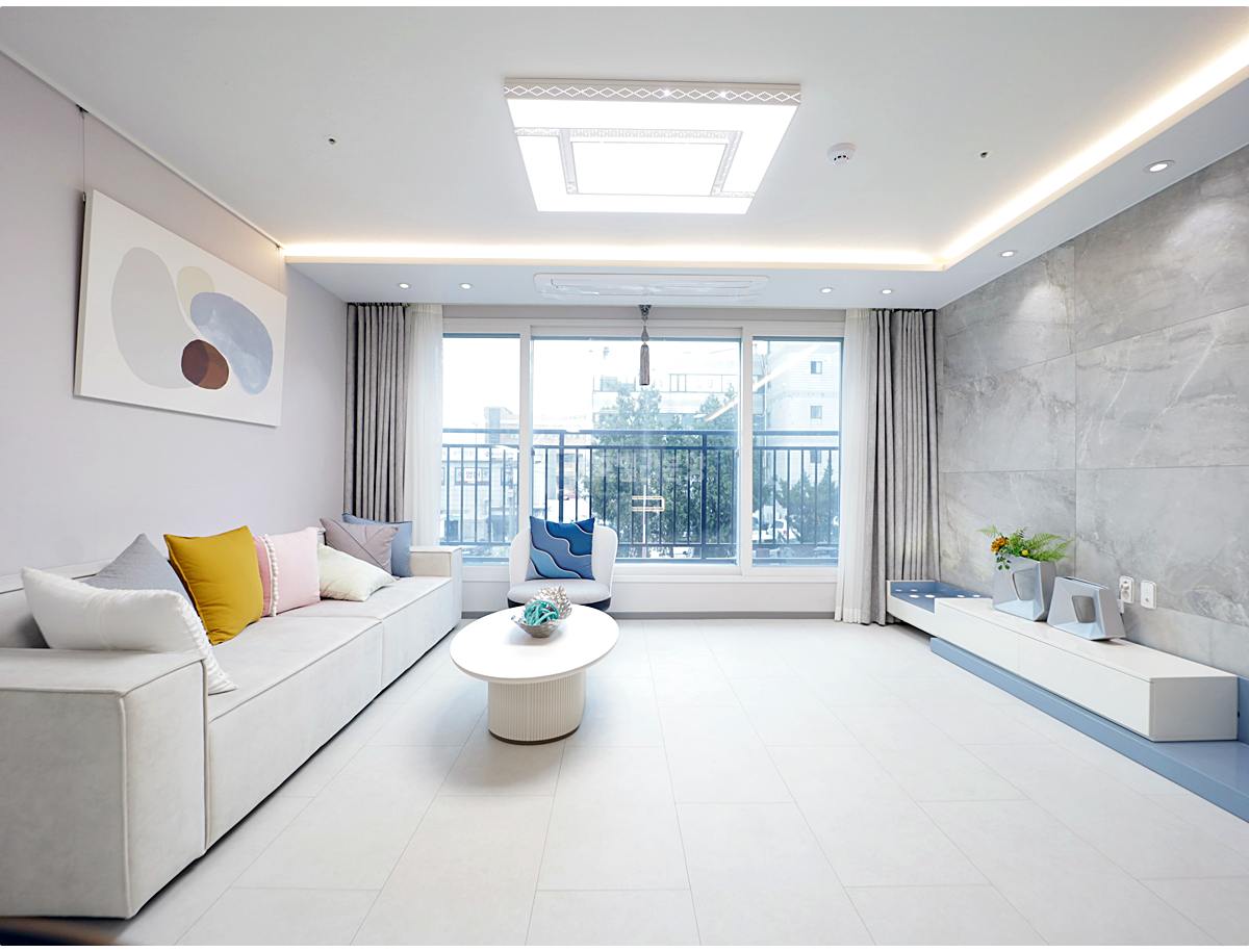 문을 열고 들어서면 가장 먼저 탁 트인 개방감이 반겨줍니다. 12층 고층 건물의 장점을 살려 앞 건물 막힘없이 채광이 쏟아져 들어와요. 4인용 소파를 둬도 넉넉한 공간에 고급스러운 그레이톤 마블 타일 아트월이 시공되어 있어, 별다른 인테리어 없이도 갤러리 같은 분위기를 연출합니다. 천장 시스템 에어컨은 기본 옵션이라 공간 활용도가 더욱 높습니다.