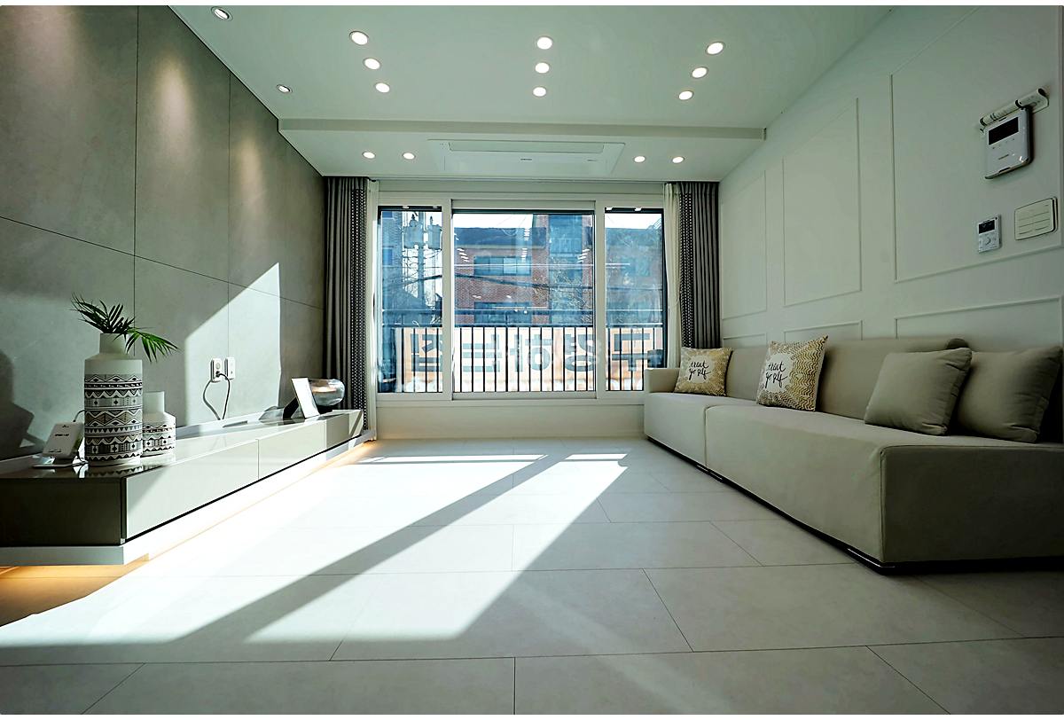 본오동신축빌라 거실은 밝은 채광이 가장 먼저 체감되는 공간입니다. 웨인스코팅 아트월이 고급스러운 분위기를 만들어 내고, 다운라이트 조명과 매립형 시스템 에어컨이 천장을 깔끔하게 정리해 줘요. 4인용 소파를 두고도 여유가 남을 만큼 면적이 넉넉합니다. 방 3개는 모두 직각의 반듯한 구조로, 안방에는 전용 욕실과 시스템 에어컨이 갖춰져 있고, 작은방은 발코니로 연결되어 세탁·건조 공간으로 쓰기에 적합해요. 바닥재는 내구성과 관리 편의성을 동시에 갖춘 타일 강마루로 마감되어 있습니다.