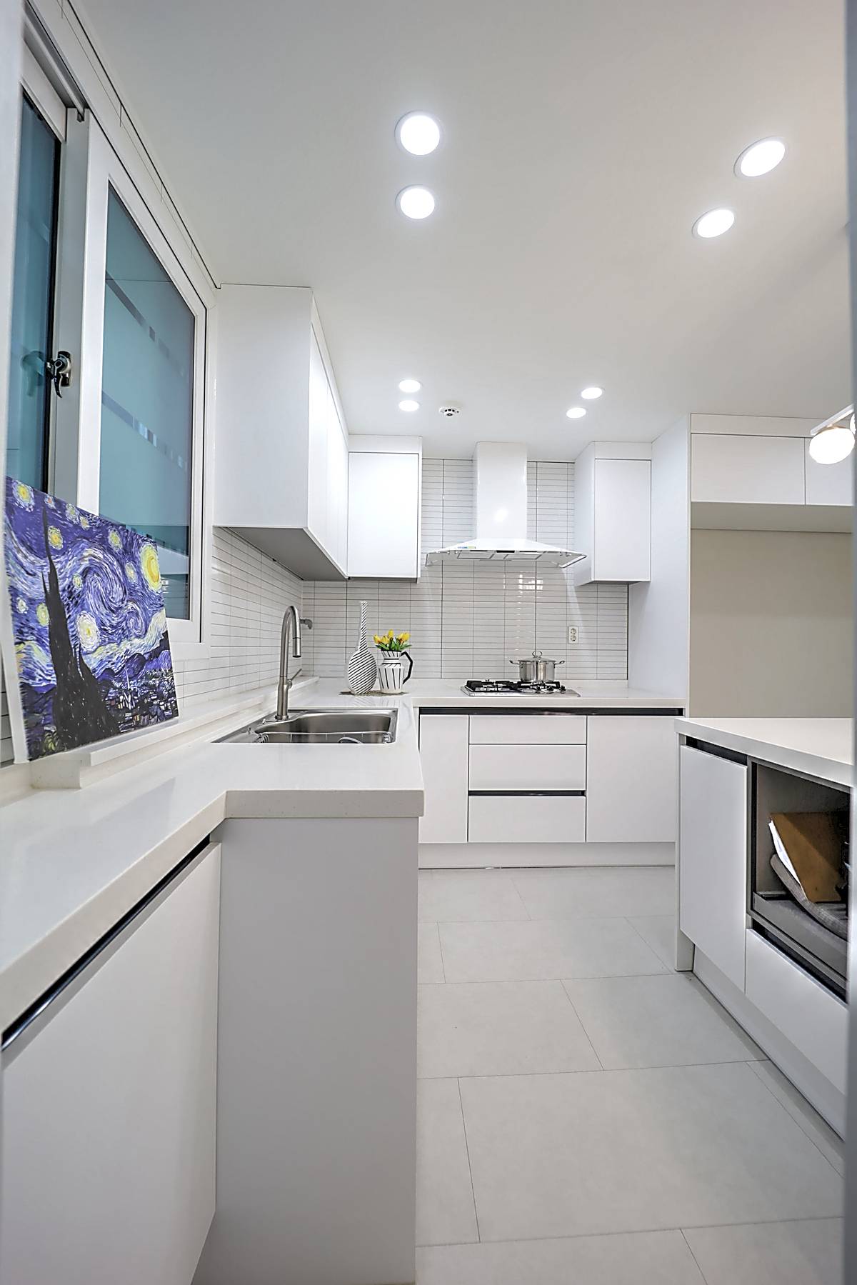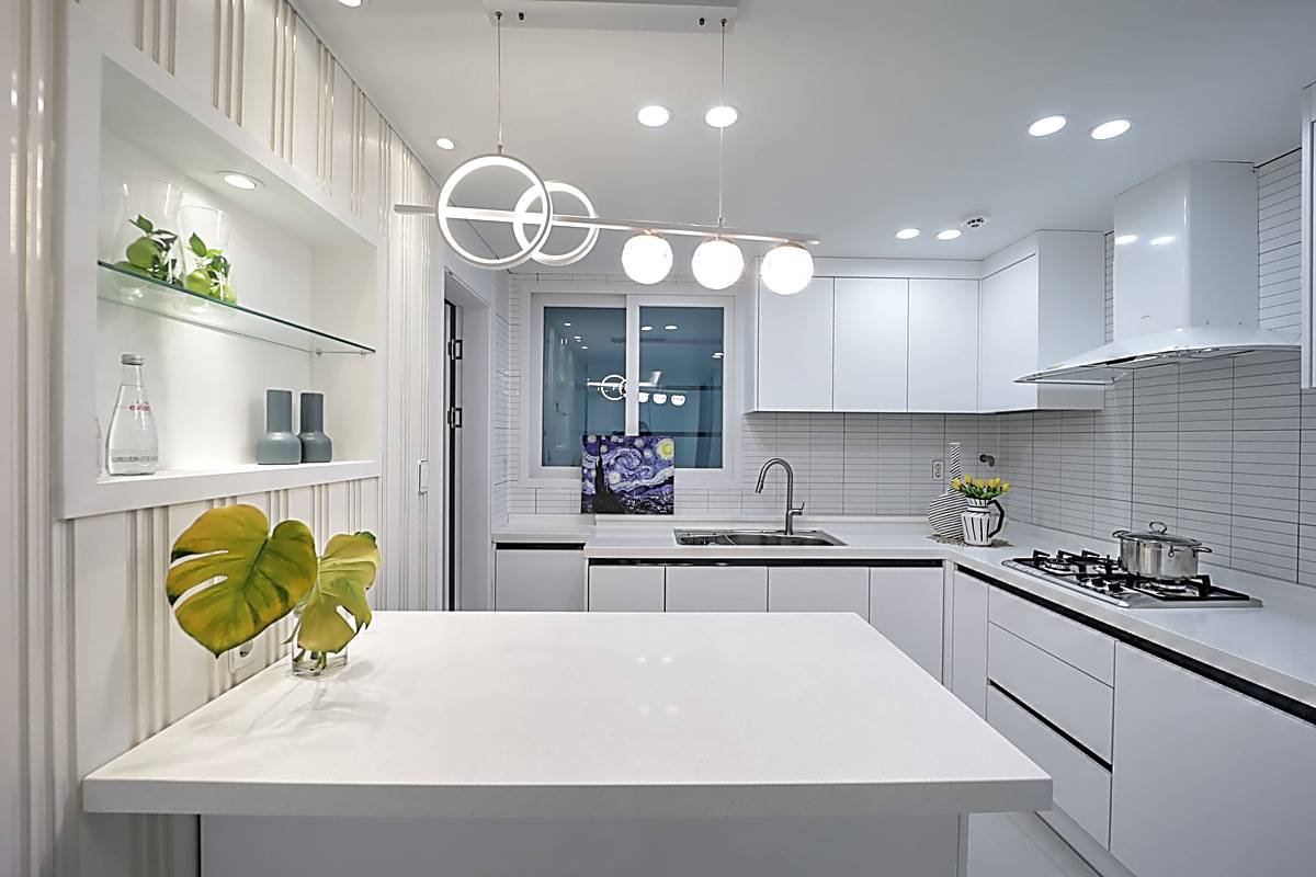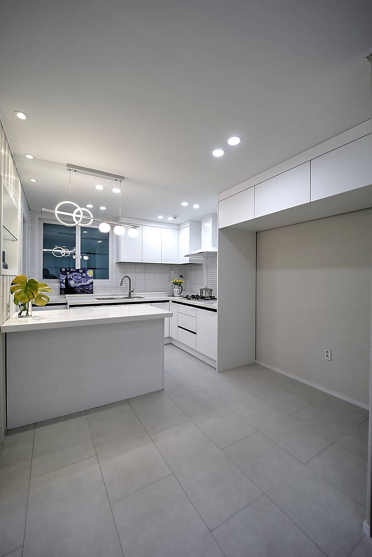 주방은 거실과 분리된 구조로 설계되어 조리 시 발생하는 냄새와 소음을 차단할 수 있습니다. 싱크대와 양문형 냉장고 2대를 배치할 수 있는 넉넉한 공간이 확보되어 있으며, 조리대 겸용 아일랜드 식탁이 마련되어 있어 실용성과 감각적인 디자인을 동시에 만족시킵니다. 3구 가스레인지와 환기창이 설치되어 쾌적한 조리환경을 제공합니다.