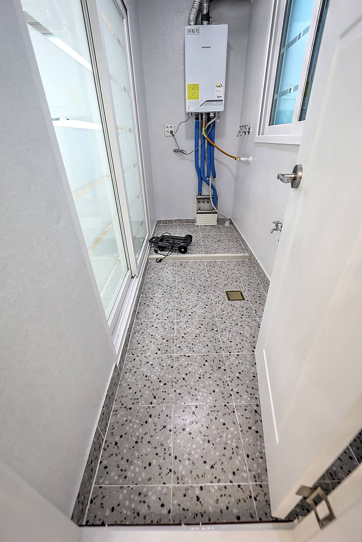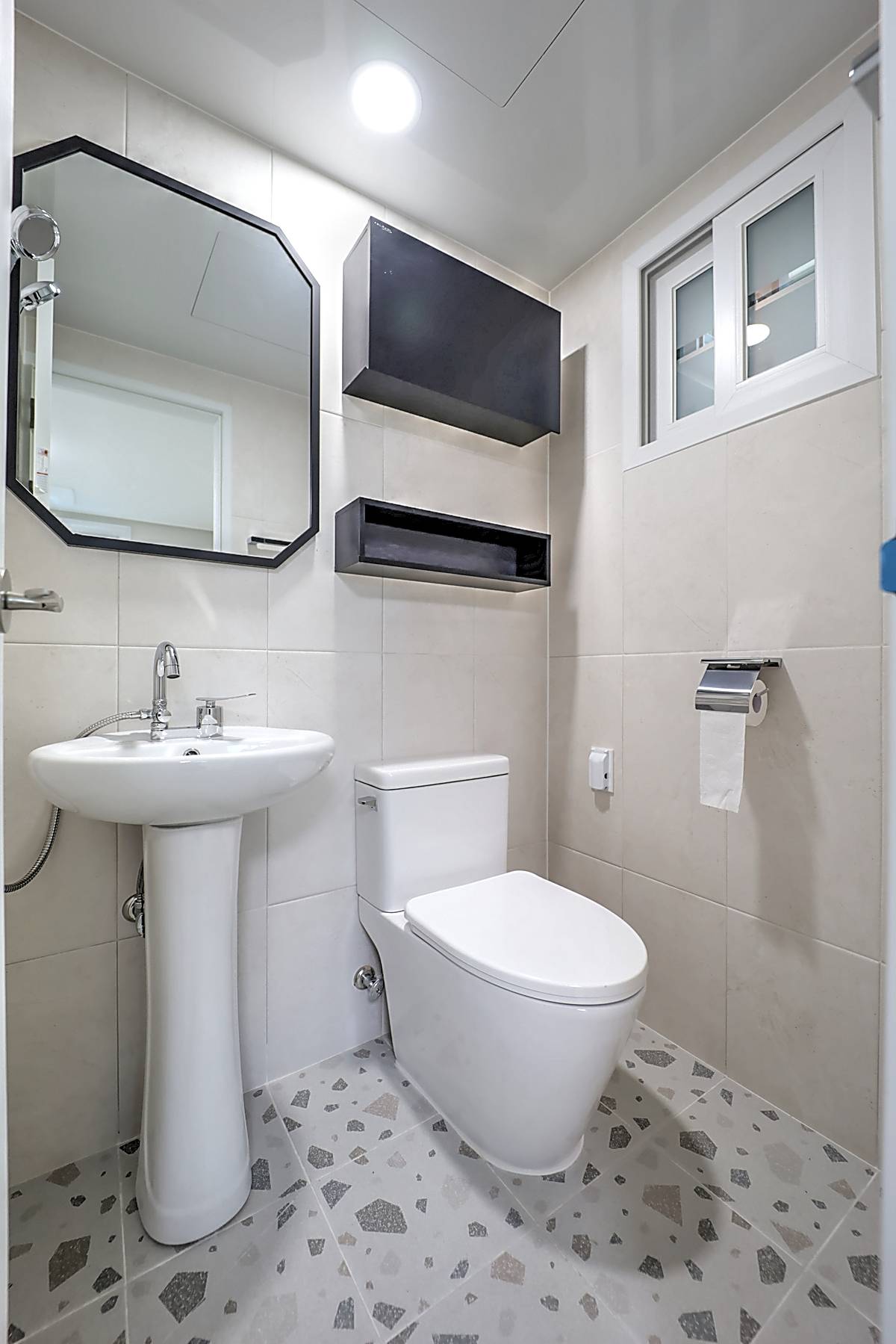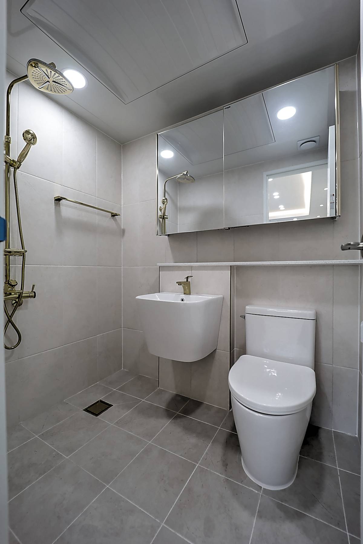 2개의 욕실 모두 샤워 부스가 설치되어 있으며, 해바라기 샤워기, 젠다이 선반, 수납장 등 기본 구성이 완벽하게 갖춰져 있습니다. 메인 욕실은 화이트&골드 조합으로, 안방 욕실은 화이트&블랙 조합으로 포인트를 주어 세련된 느낌을 더했습니다. 바닥은 미끄럼 방지 효과가 뛰어난 논슬립 타일로 마감되어 안전성까지 고려했습니다.