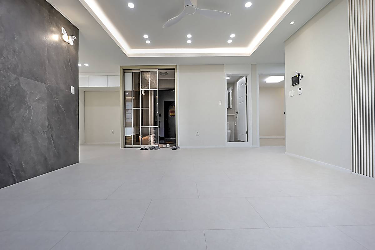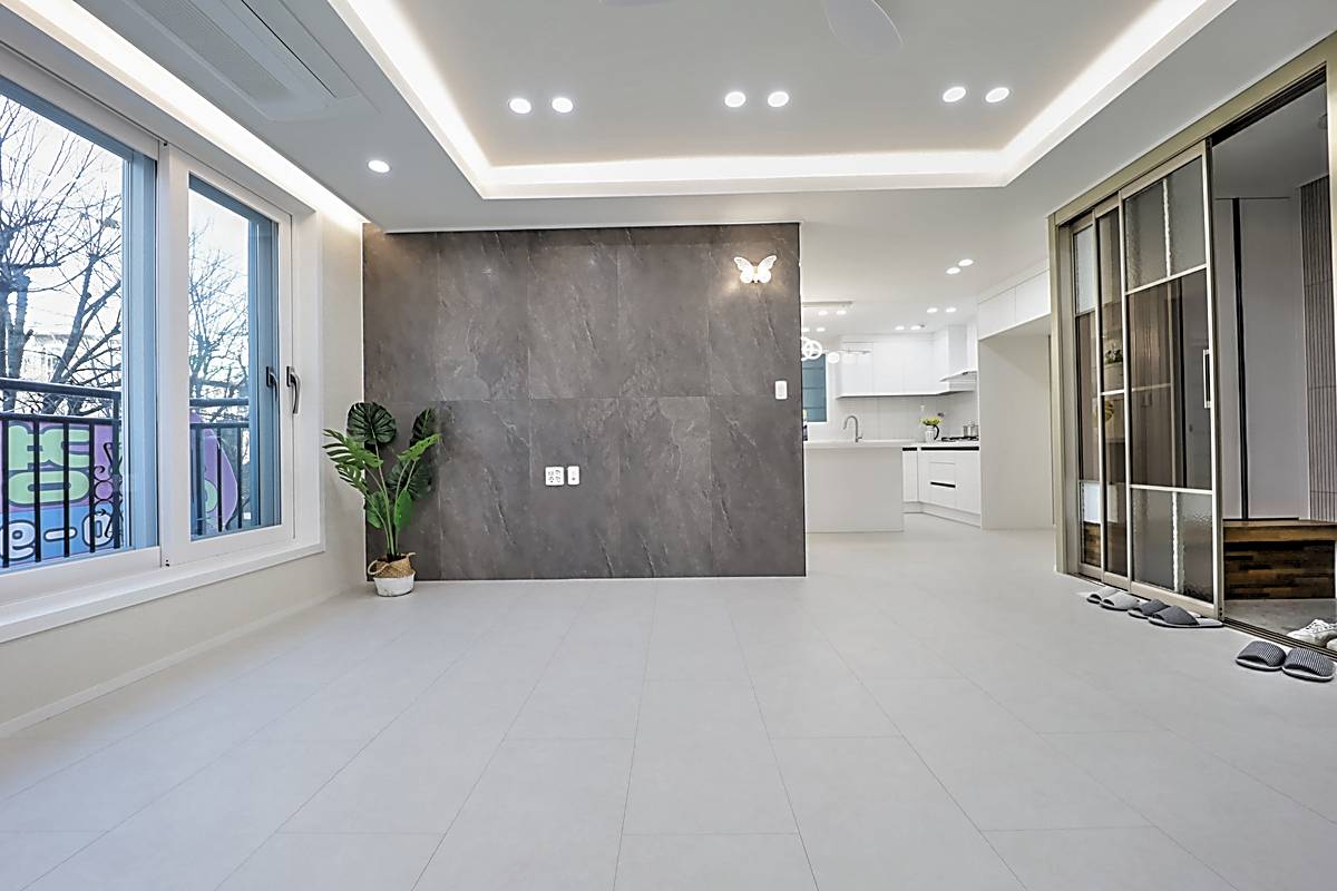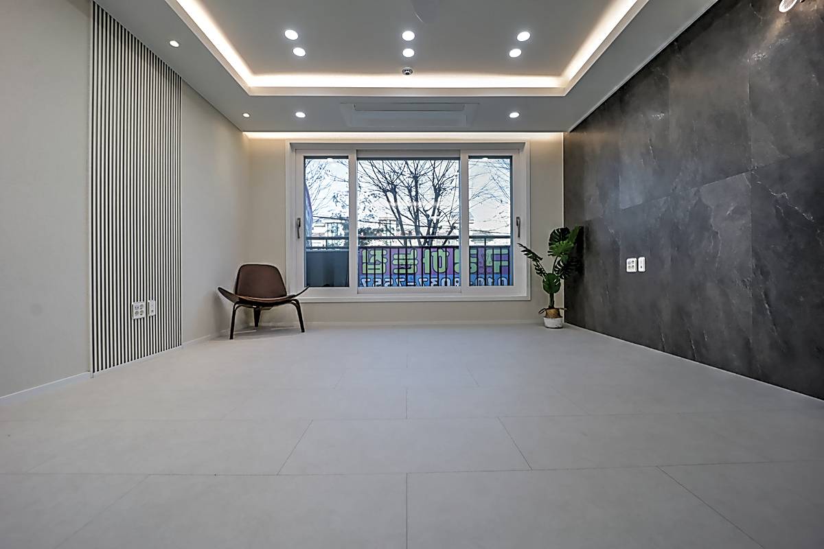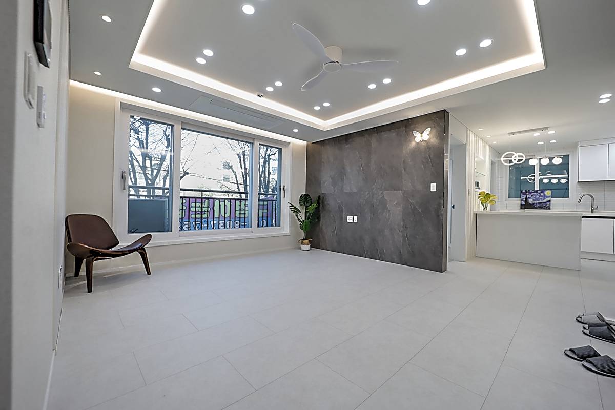 외관은 고급스러운 대리석 마감으로 견고하게 시공되었으며, 내부는 화사하고 밝은 톤의 인테리어로 꾸며져 모든 연령대가 선호하는 디자인을 구현했습니다. 거실은 전면 개방형 구조로 탁 트인 조망을 제공하며, 4인용 소파 배치와 충분한 시청각 거리를 확보할 수 있는 공간감을 자랑합니다.