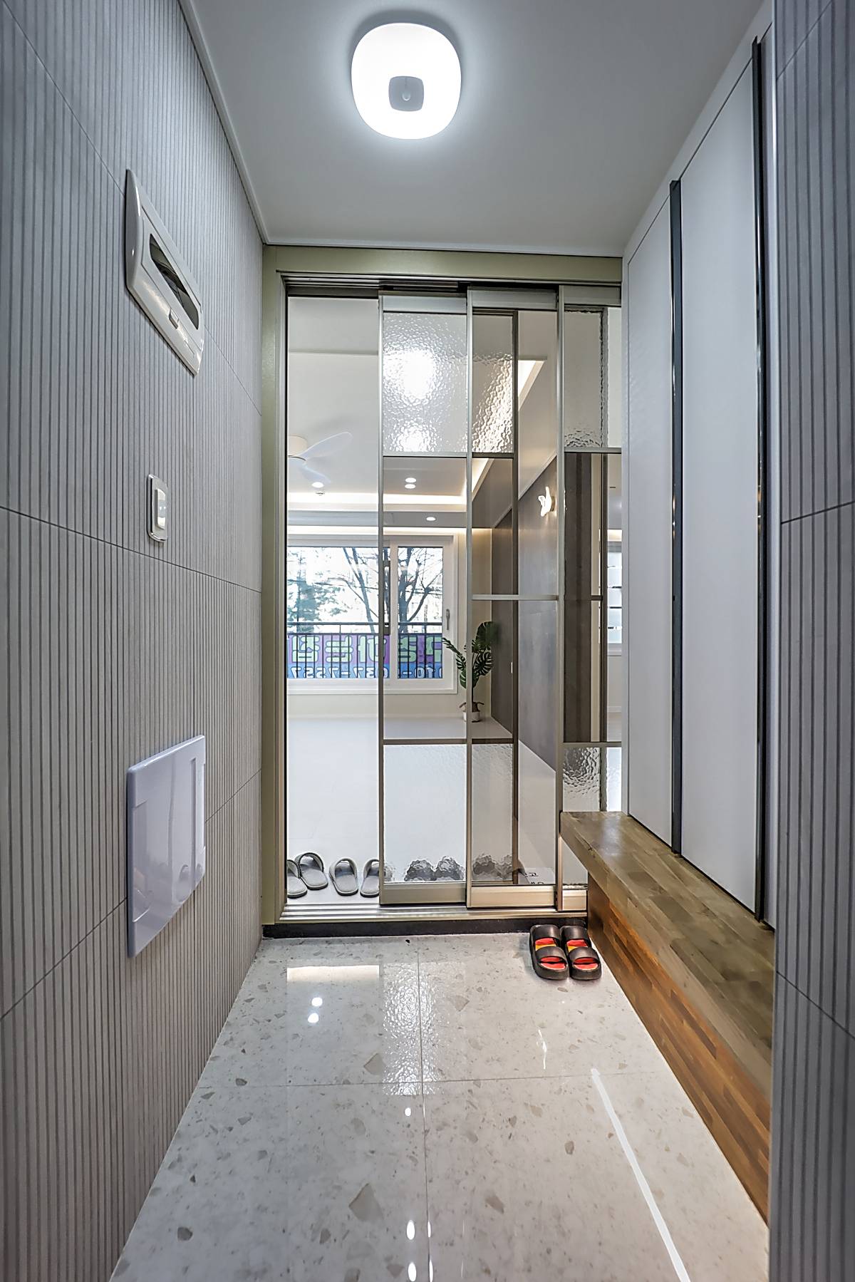 현관에는 화이트 톤의 신발장과 벤치형 의자가 마련되어 있으며, 3연동 중문과 일괄소등 스위치 등 세심한 편의 기능이 곳곳에 배치되어 있습니다.