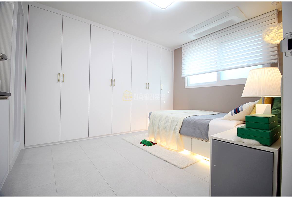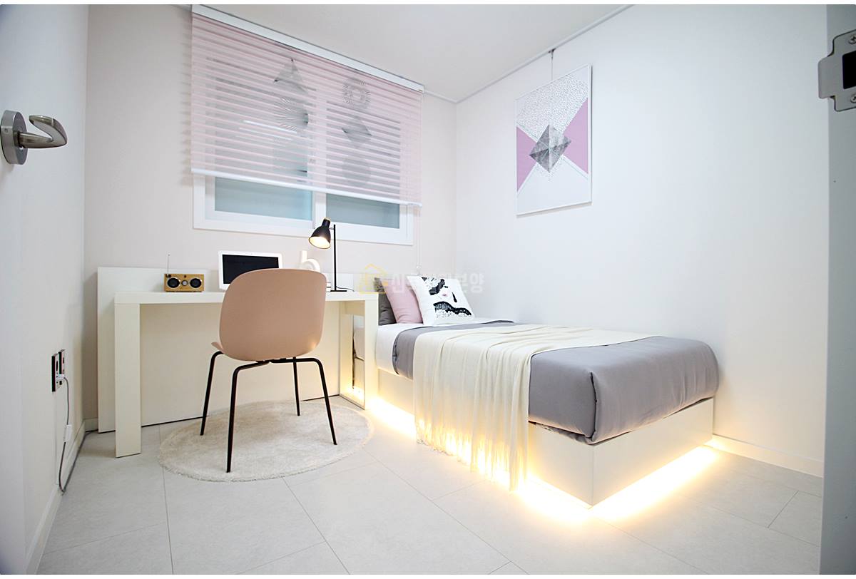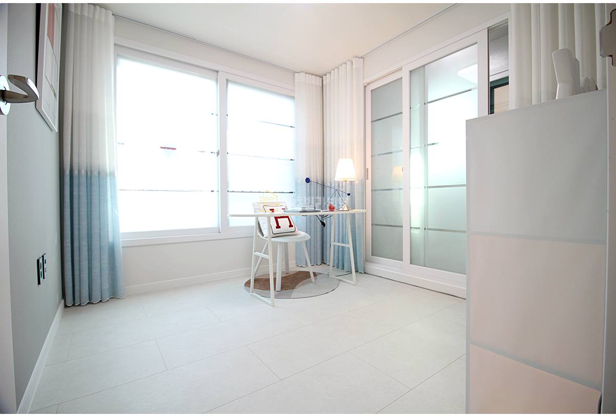 모든 방은 네모 반듯하고, 비슷한 콘셉트로 통일감을 주었습니다. 특히 안방 특화 설계가 돋보이는데, 시스템 에어컨은 물론이고 붙박이장과 건식 세면대를 품고 있는 파우더룸까지 완벽하게 마련되어 있어 만족도를 더했습니다.