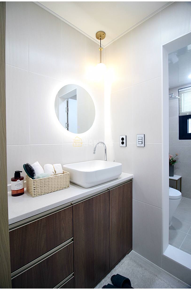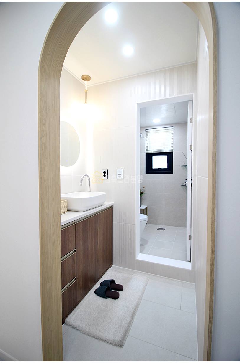 안산신축빌라 매매 욕실은 우드 아치형 게이트로 포인트를 주었습니다. 건식 세면대로 공간이 더욱 특별해 보이며, 안쪽으로 용변공간과 샤워공간이 마련되어 있습니다.