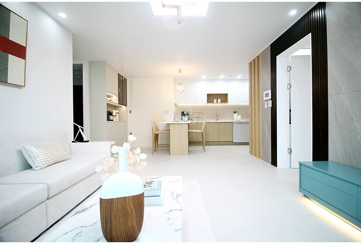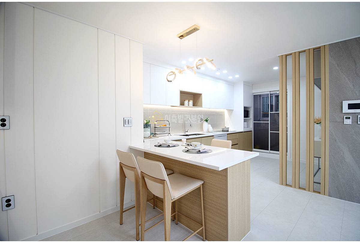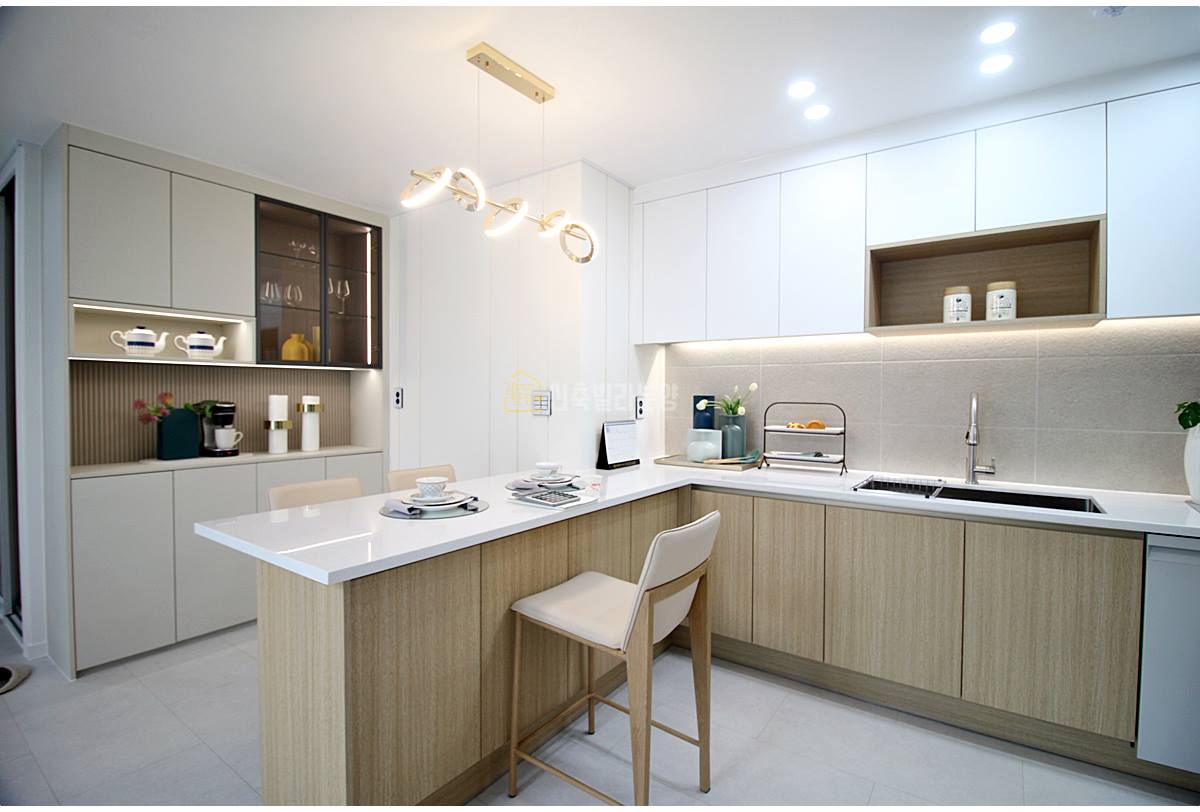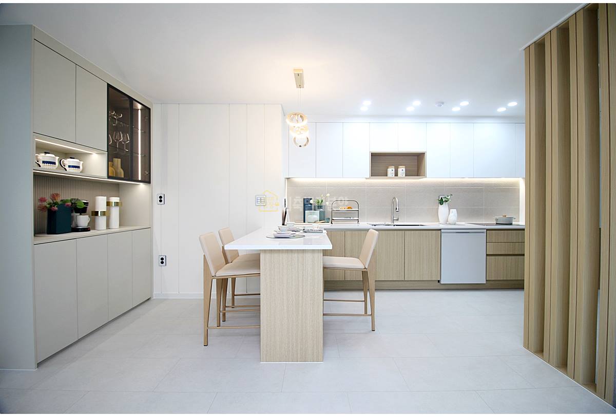 아일랜드 식탁이 마련되어 편안한 식사를 도와주며, 홈바 공간도 마련되어 더욱 특별한 분위기를 연출합니다. 또한 주방 옆 발코니 구조로 최적화된 동선을 자랑합니다.