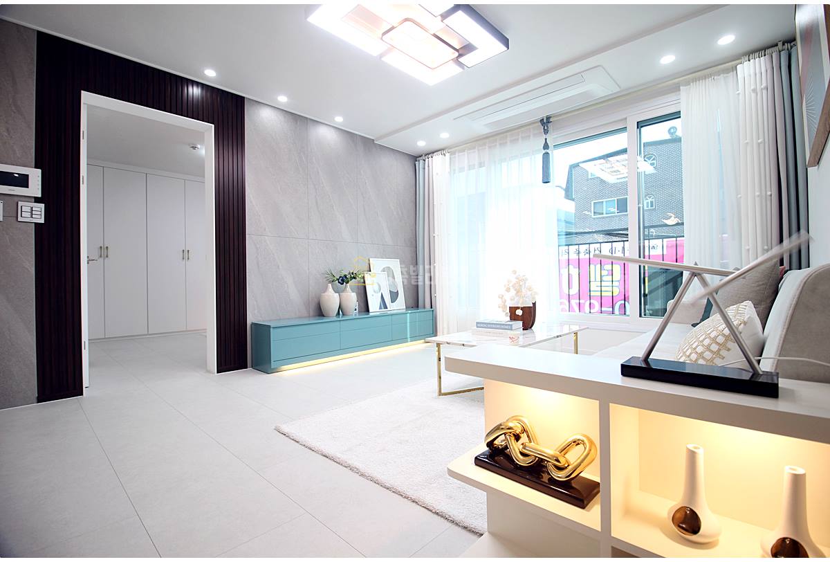 정갈하고 군더더기 없는 모습의 거실입니다. 천장으로 시스템 에어컨이 매립되어 한여름에도 더위와 습기 걱정 없이 쾌적합니다. 아트월 공간은 고급스러운 무드의 그레이 타일로 마감되었고, 바닥재는 선호도 좋은 광폭 강마루로 시공했습니다.