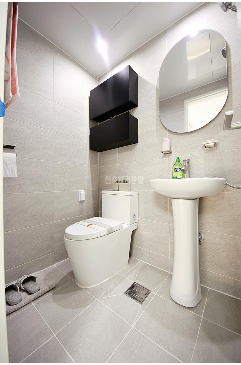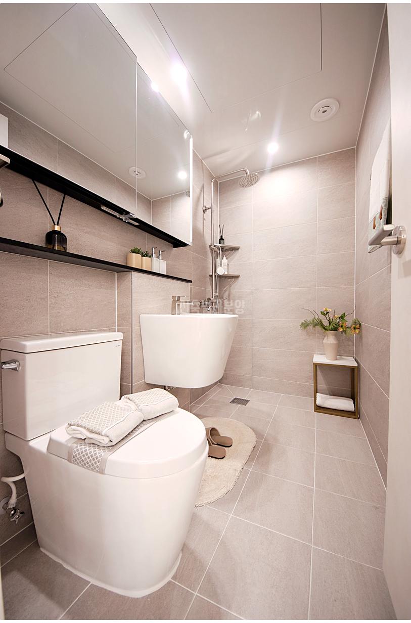 선부동신축빌라 욕실은 여유로운 크기로 만들어졌습니다. 거울이 달린 수납함과 젠다이 선반이 있어 수건이나 자주 쓰는 물건들을 보관하기 좋습니다. 샤워 부스에는 코너 선반도 마련되어 있어 세면 용품을 올려놓을 수 있습니다.